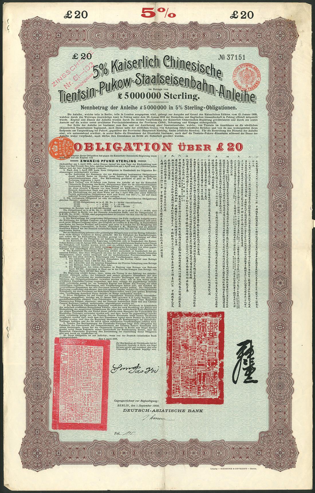 Tientsin Pukow Railway 5% Loan of 1908, a group of 50 bonds for £20, German issue, large format, mauve and red with blue underprint, with coupons, mixed condition but most are very fine and better. (50)