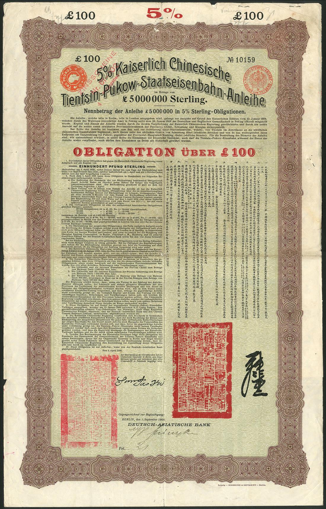 Tientsin Pukow Railway 5% Loan of 1908, a group of 50 bonds for £100, German issue, large format, brown and red with green underprint, with coupons, mixed condition but most are very fine and better. (50)