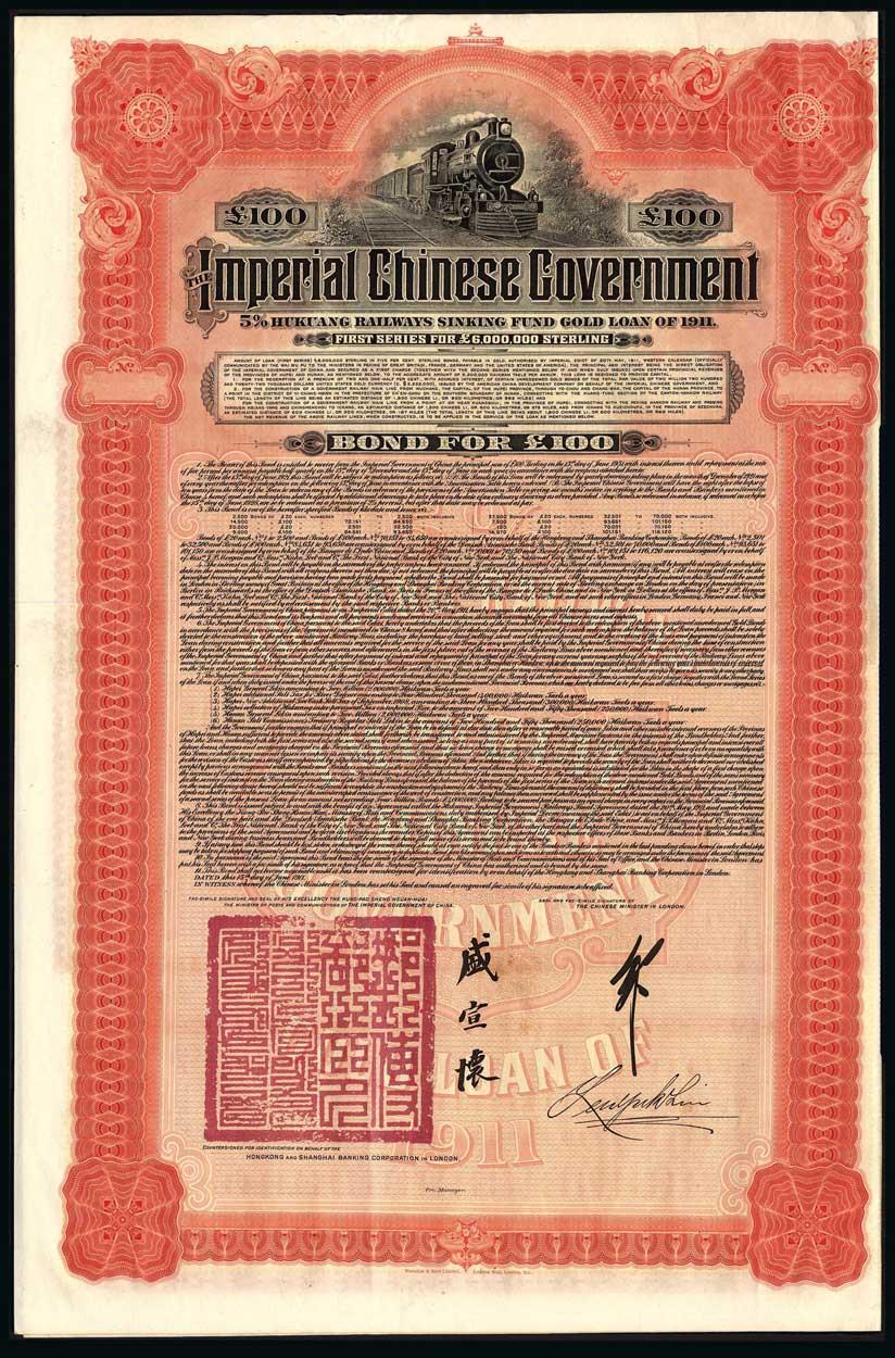 Imperial Chinese Government 5% Hukuang Railways Sinking Fund Gold Loan of 1911, unissued bond for £100, countersigned by Hongkong and Shanghai Banking Corporation, large format, steam train at top, red and black, printed by Waterlow & Sons, with full coupons sheet, extremely fine and extremely rare, 4 known [R10]
