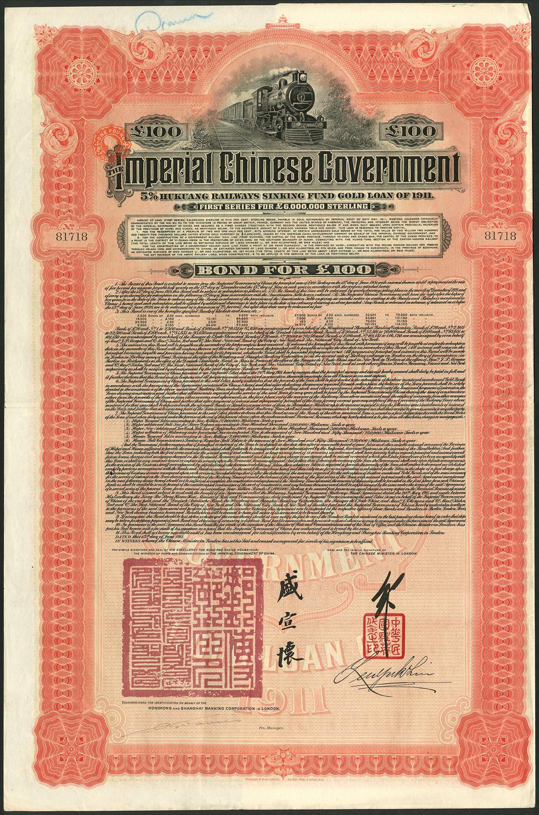 China: 1911 5% Hukuang Railways Sinking Fund Gold Loan, a group of 25 bonds for £100, issued by the Hongkong & Shanghai Banking Corporation, large format, steam train at top, red and black, printed by Waterlow & Sons, with coupons, a handful with tears, fine to very fine. (25)