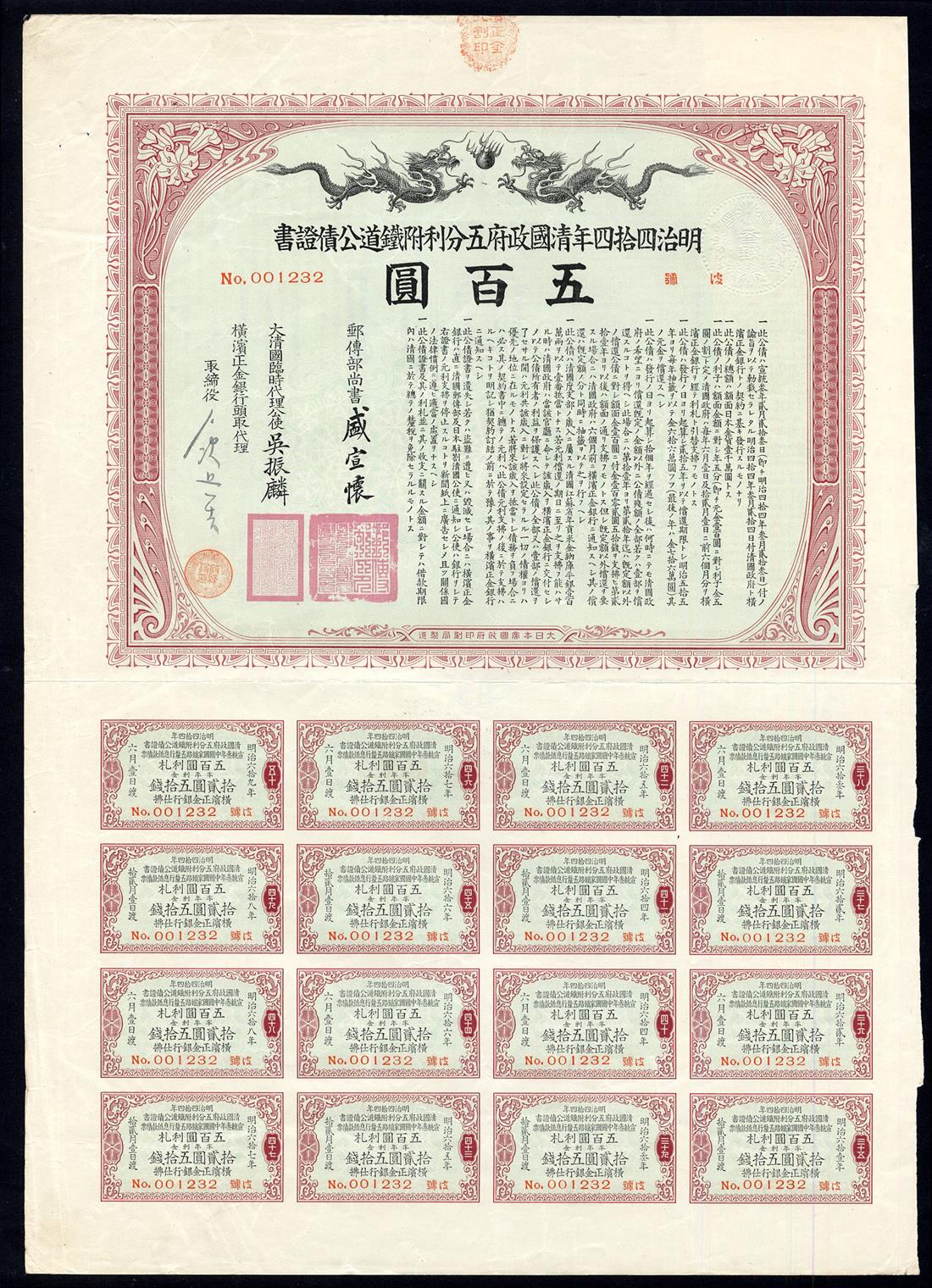 1911 5% Imperial Railway Loan, bond for 500 yen, no. 001232, issued by the Yokohama Specie Bank, ornate border, Chinese dragons at top, mauve and black, pale green underprint, text in Chinese with English on the reverse, with coupons, pinholes, near extremely fine.