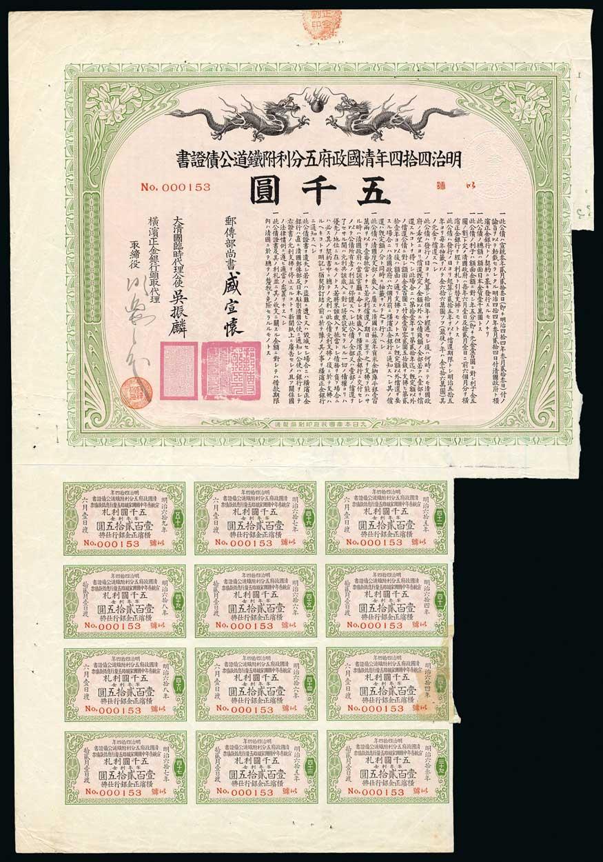 1911 5% Imperial Railway Loan, bond for 5000 yen, no. 000153, issued by the Yokohama Specie Bank, ornate border, Chinese dragons at top, green and black, pink underprint, text in Chinese with English on the reverse, with coupons, pinholes, cut close at right, very fine.