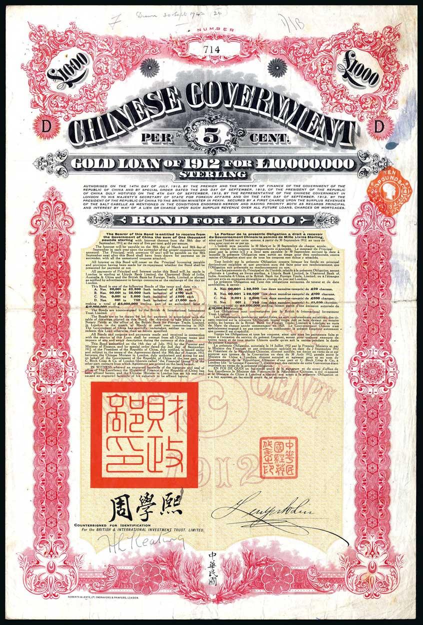 1912 5% 'Crisp' Gold Loan, bond for £1000, no.714, large format, red with orange underprint, red chops at bottom, with coupons, split at centre fold, ink stain top right margin, good fine and scarce.