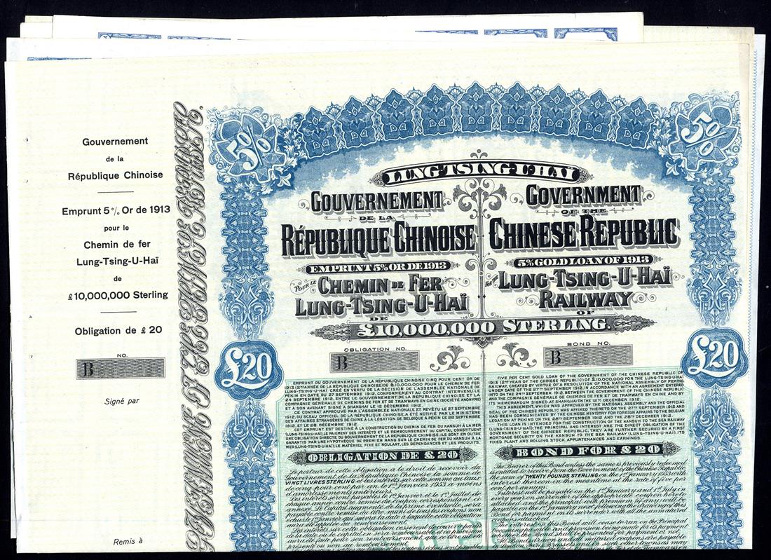 1913 Lung Tsing U Hai Railway, 5% Loan, £20 unissued reserve stock, with coupons, together with other certificates (6) comprising Indo-China, La Laotienne, founders share, 1900, attractive piece with vignettes in each corner; Cia General de Tabacos de Filipinas, 500 peseta share, Barcelona 1882, very attractive border; Cia Generale des Philippines, preference share, Brussels 1899, red; Philippines, Bua Mining Co. Ltd., P$100 shares, Manila 191[0], 2 examples, and Cultuuronderneming Way-Lima, 1000 gulden bond, Rotterdam 1897, lacks coupons, very fine and better. (7)