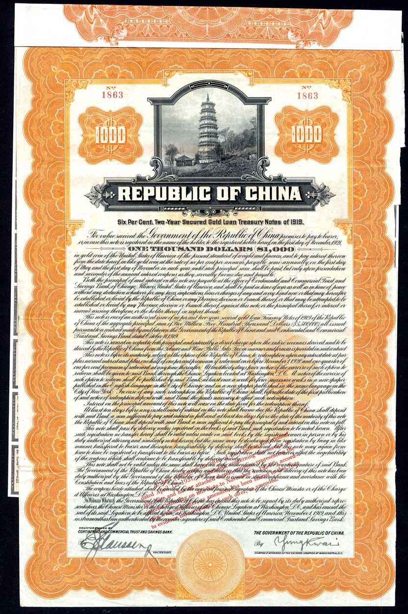 1919, 6% Two-Year Secured Gold 'Chicago Bank' Loan, $1000 bond, No.1863, vignette of Pagoda at top, orange and black, printed by the American Bank Note Co., with coupons, good very fine [R6*]