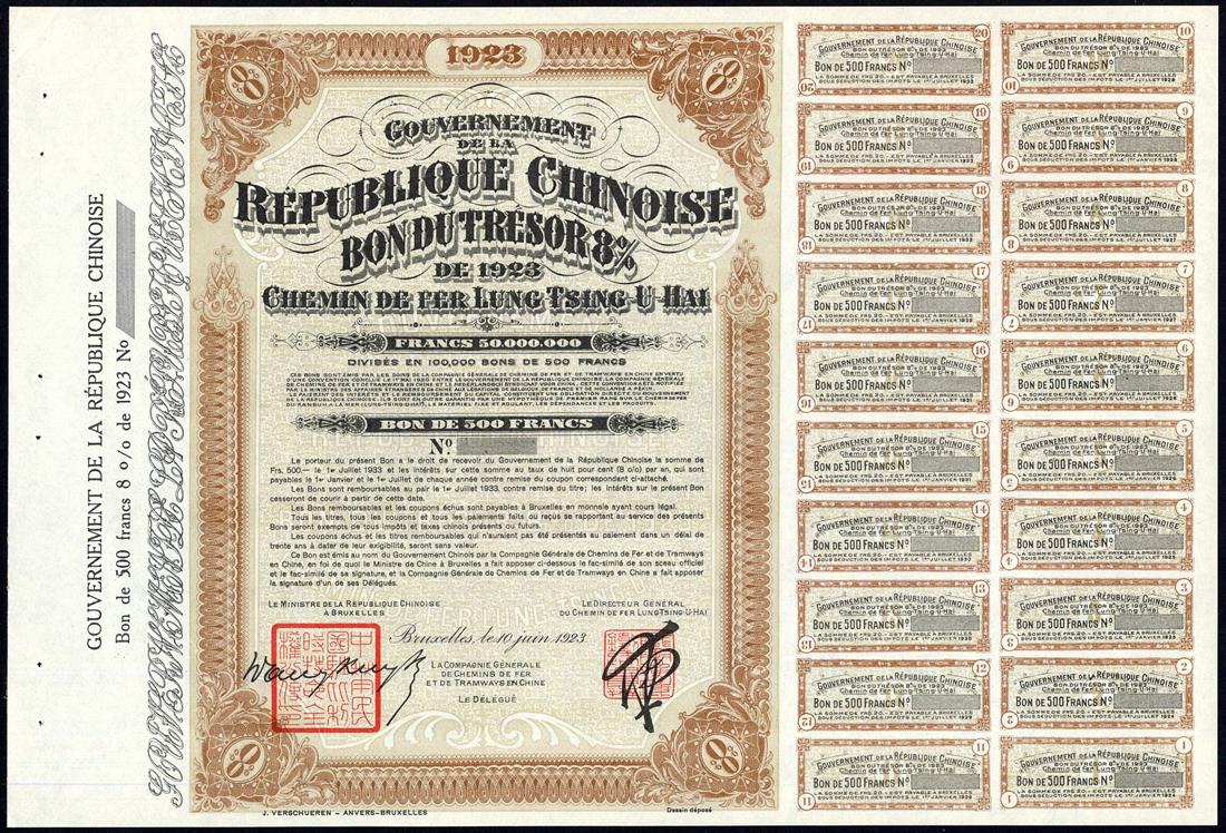 Lung Tsing U Hai Railway, 1921 and 1923 Loans, unissued reserve stock, bonds for 500 francs, together with Banque Industrielle de Chine, 500 franc shares, 1913, 1919 and 1920; Compagnie Financiere Belgo-Chinoise, founders shares, issued and unissued, 1926, $50 shares, 1926, issued, with and without coupons and unissued, and other certificates (6), very fine to extremely fine. (16)