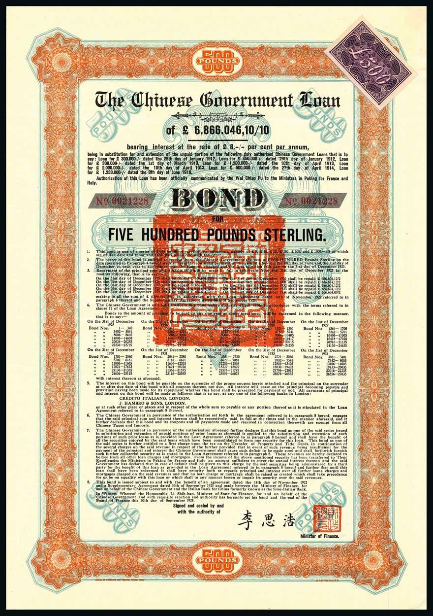 1925 8% 'Skoda' Loan, bond for £500, no.0021228, ornate border, orange and black, 'chop' in centre, with coupons, about extremely fine.