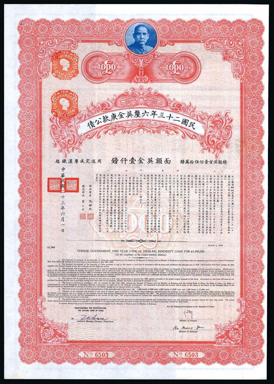 1934, 6% Sterling Indemnity Loan, bond for £1000, no. 6503, portrait of Sun Yat Sen at top, text in Chinese and English, red and blue, pink underprint, with coupons, about extremely fine