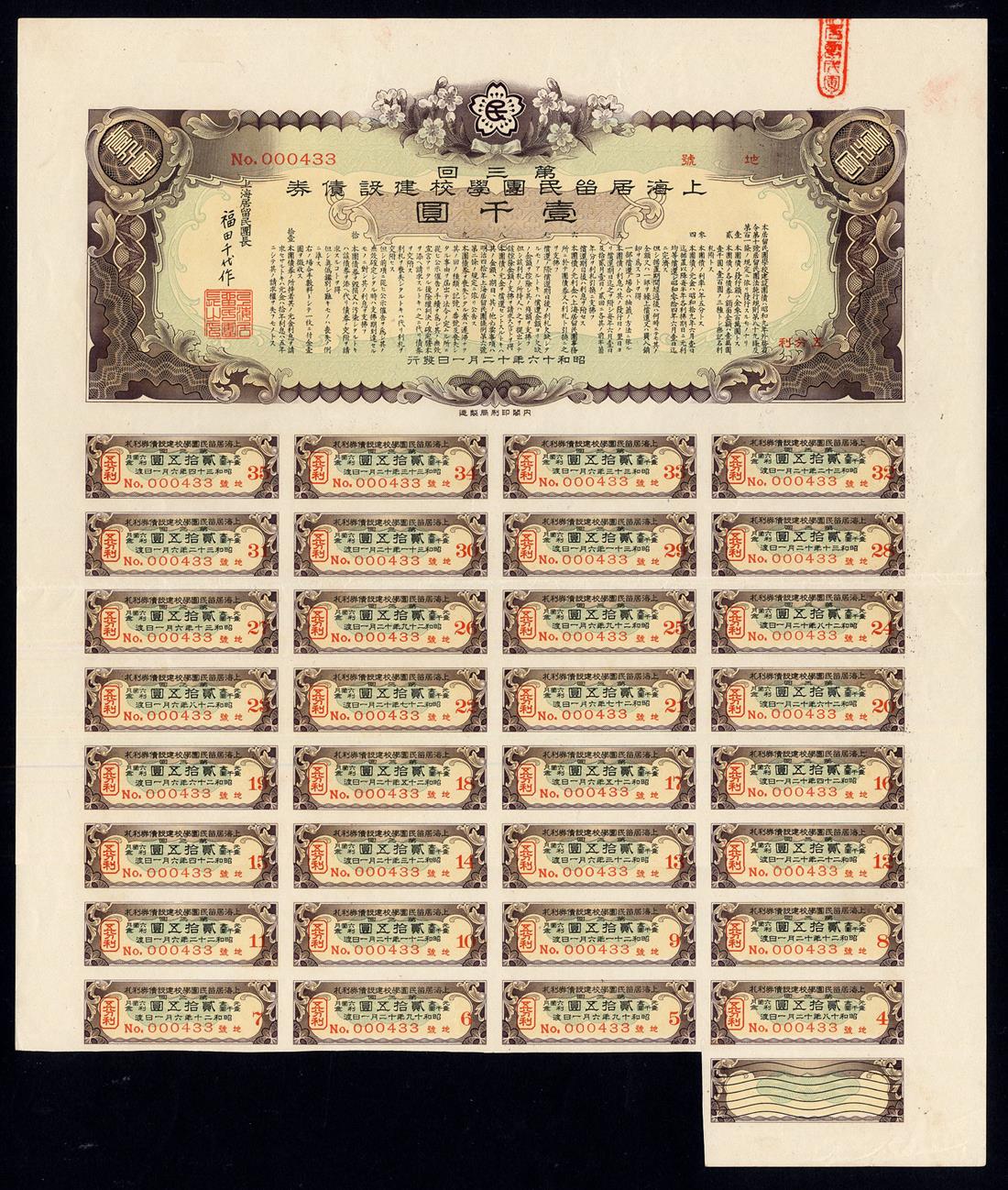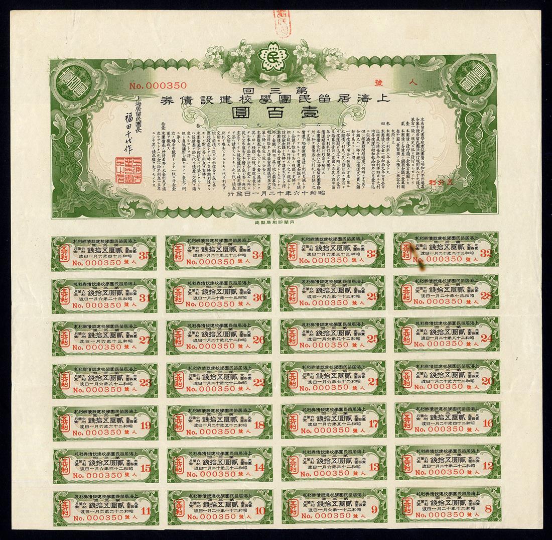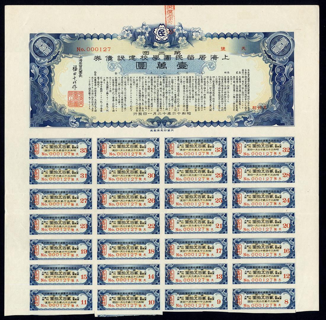 1941 Shanghai Residents 5% Educational Loan, a set of bonds for 20 yen, no.877, 100 yen, no.350, 1000 yen, no.433 and 10,000 yen, no.127, ornate borders, in typical Japanese style, brown, green, dark brown and blue respectively, with coupons, the second with rust mark on coupons otherwise extremely fine and extremely rare. (4) [R10*]