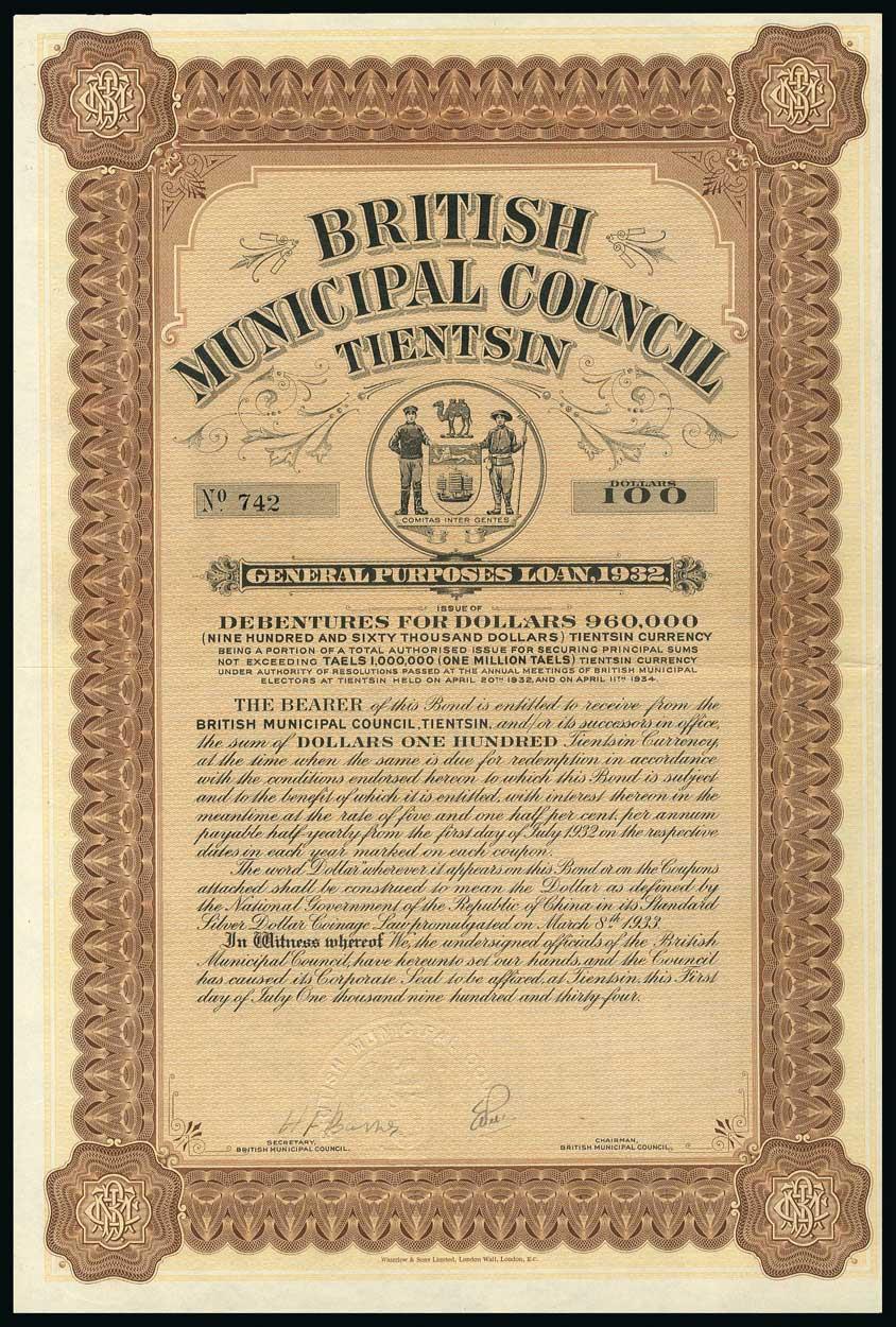 British Municipal Council Tientsin, General Purposes Loan, 1932, bond for $100 (Tientsin currency), no.742, ornate border with coat of arms of the city in centre, brown and black, printed by Waterlow & Sons, with coupons, extremely fine.