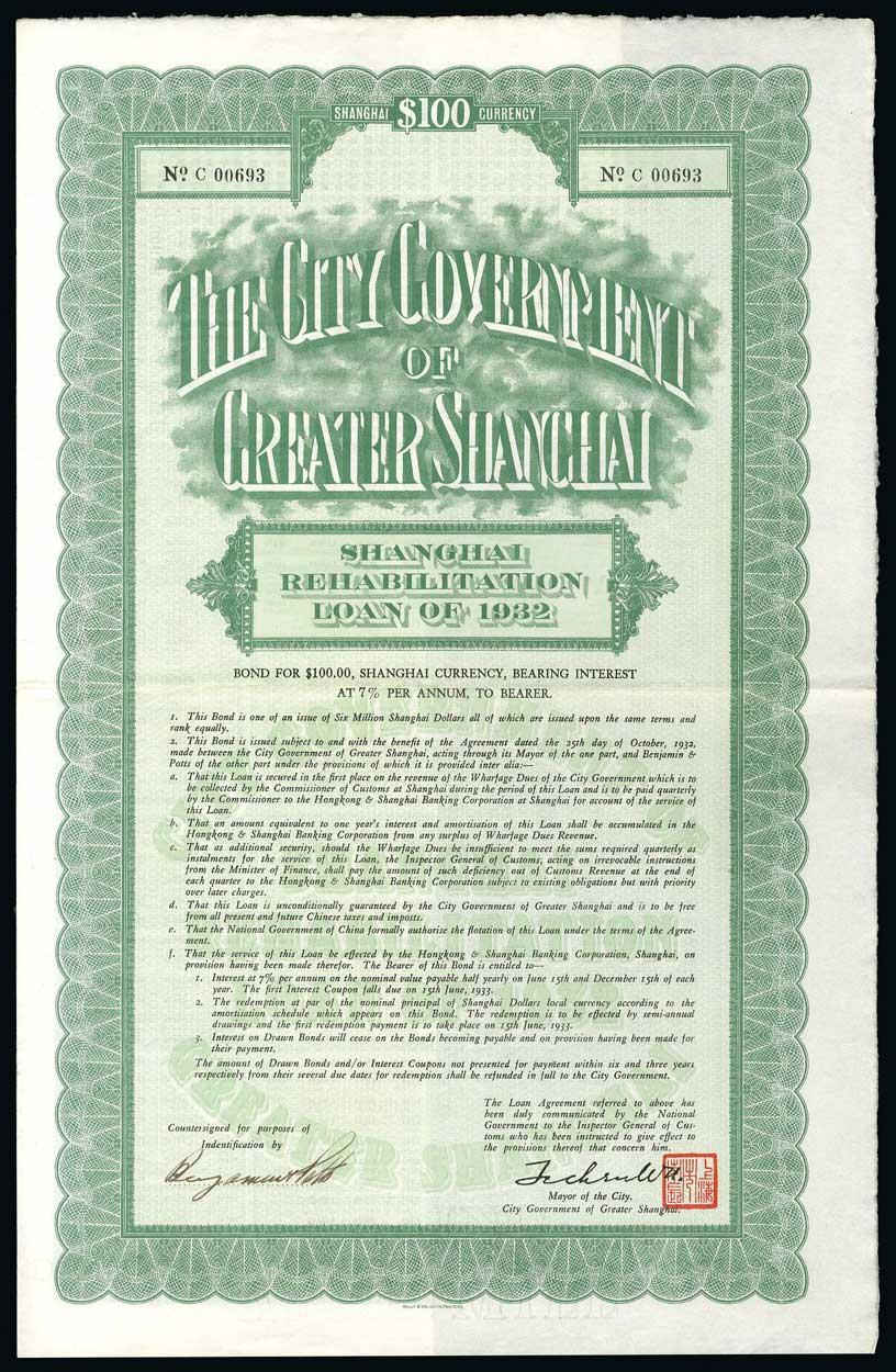 City Government of Greater Shanghai, 7% Shanghai Rehabilitation Loan, 1932, bond for $100 (Shanghai currency), no.C00693, large format piece with ornate borders, green and black, text all in English, with coupons, good very fine.
