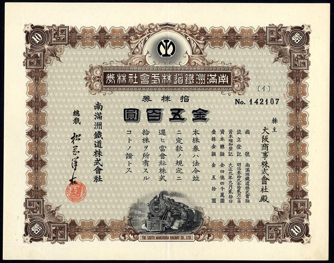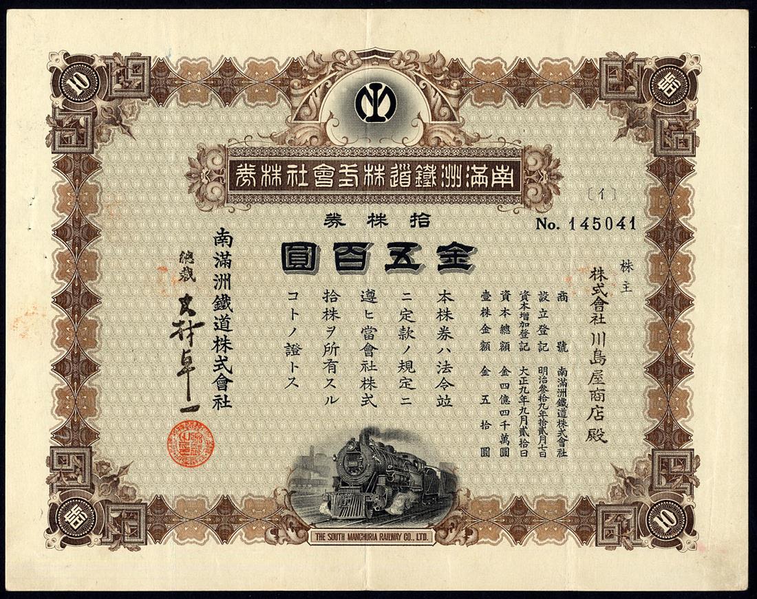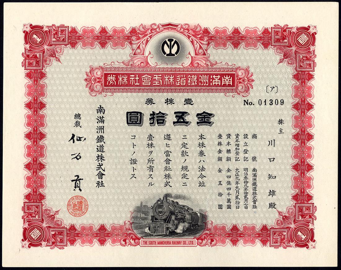 South Manchuria Railway Co. Ltd., certificates for 1 and 10 shares (2 examples with signature varieties) of 50 yen, Taisho 9 (1920), steam train at bottom, ornate border, red and brown respectively, extremely fine and very fine. (3)