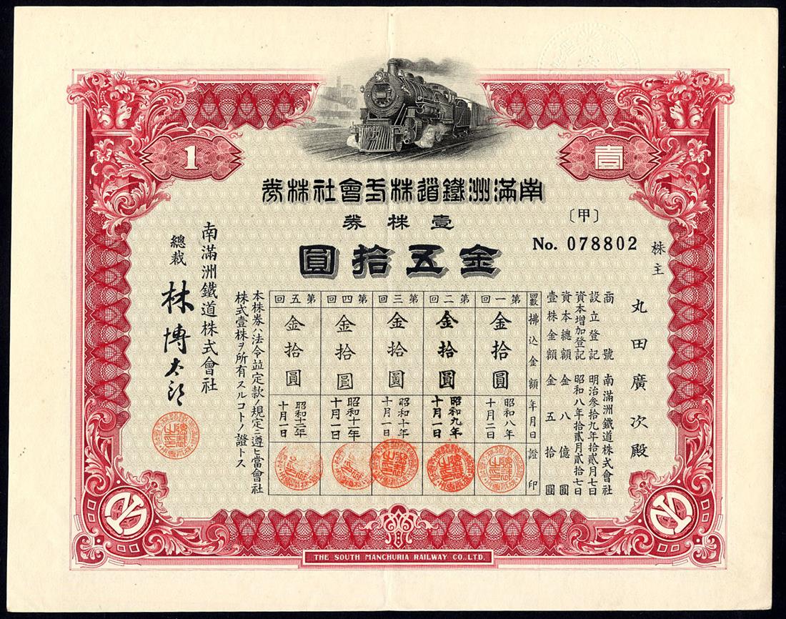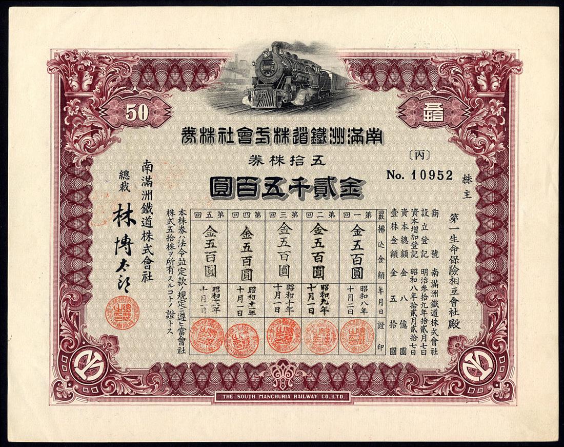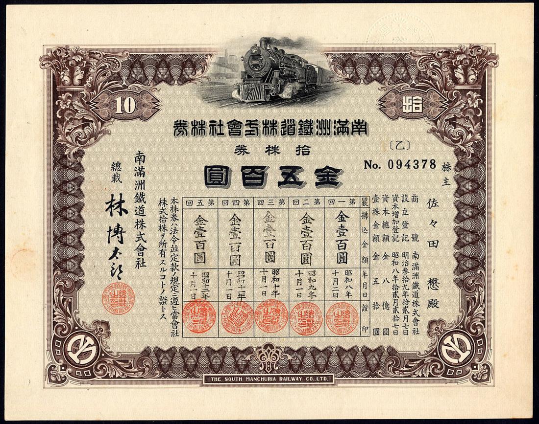 South Manchuria Railway Co. Ltd., certificates for 1, 10 and 100 shares of 50 yen, Taisho 9 (1920), steam train at top, ornate border, red, brown and green respectively, very fine, the last about very fine and rare high denomination. (3)