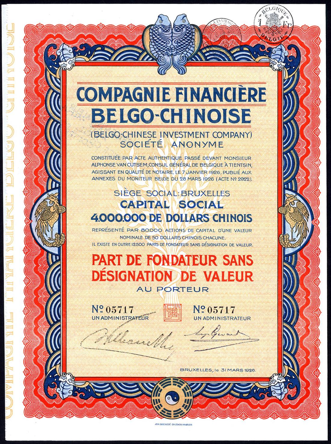 A collection of Foreign Companies operating in China (14), comprising Banque Industrielle de Chine, 500 franc share (2), capital 45 million and capital 150 million; Compagnie Financiere Belgo-Chinoise, founders shares, one issued and one unissued, $50 shares, 2 issued and one unissued, all 1926; Soc. Belge d'Entreprises en Chine, 500 franc share, 1924, cancelled, plus 2 unissued shares dated 1977; Cie Generale de Chemins de Fer et de Tramways en Chine, 250 francs, 1920, cancelled and 2 unissued shares dated 1947, and lastly Cie de Tramways & d'Eclairage de Tientsin, ordinary share, 1919, with coupons, very fine to extrmely fine. (14)