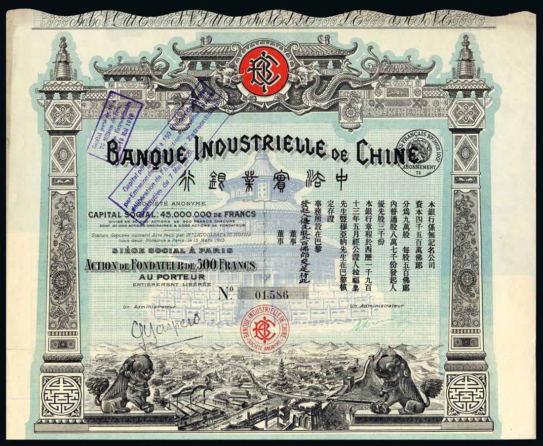 Banque Industrielle de Chine, 500 franc Founders share, 1913, no.1586, traditional Chinese design with architectural border and cityscape flanked by dragons at bottom, blue and black, with coupons, good very fine.