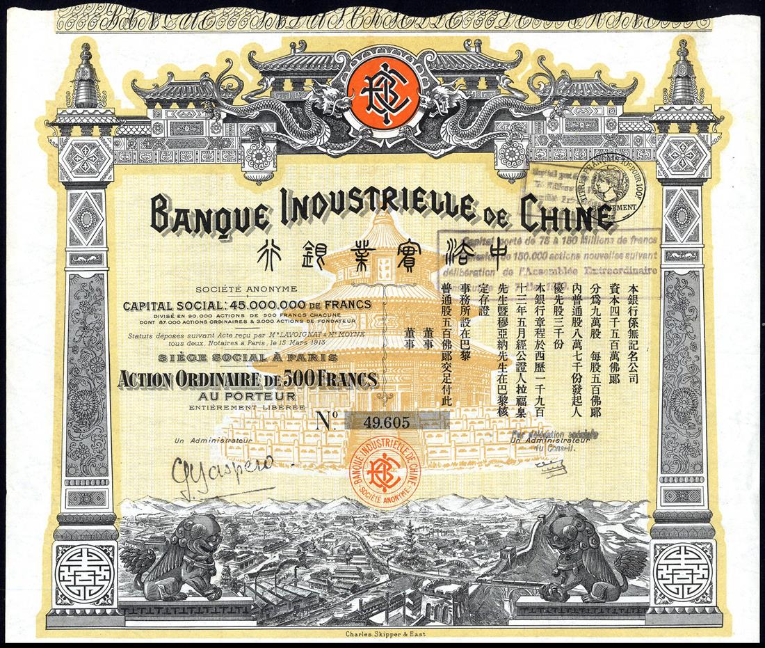 Banque Industrielle de Chine, a group of certificates for one share of 500 francs (14), capital 45 million (2), capital 75 million (4), capital 150 million (8), panoramic view of city, dragons at top, yellow and black, text in French and Chinese, mostly very fine to extremely fine. (14)