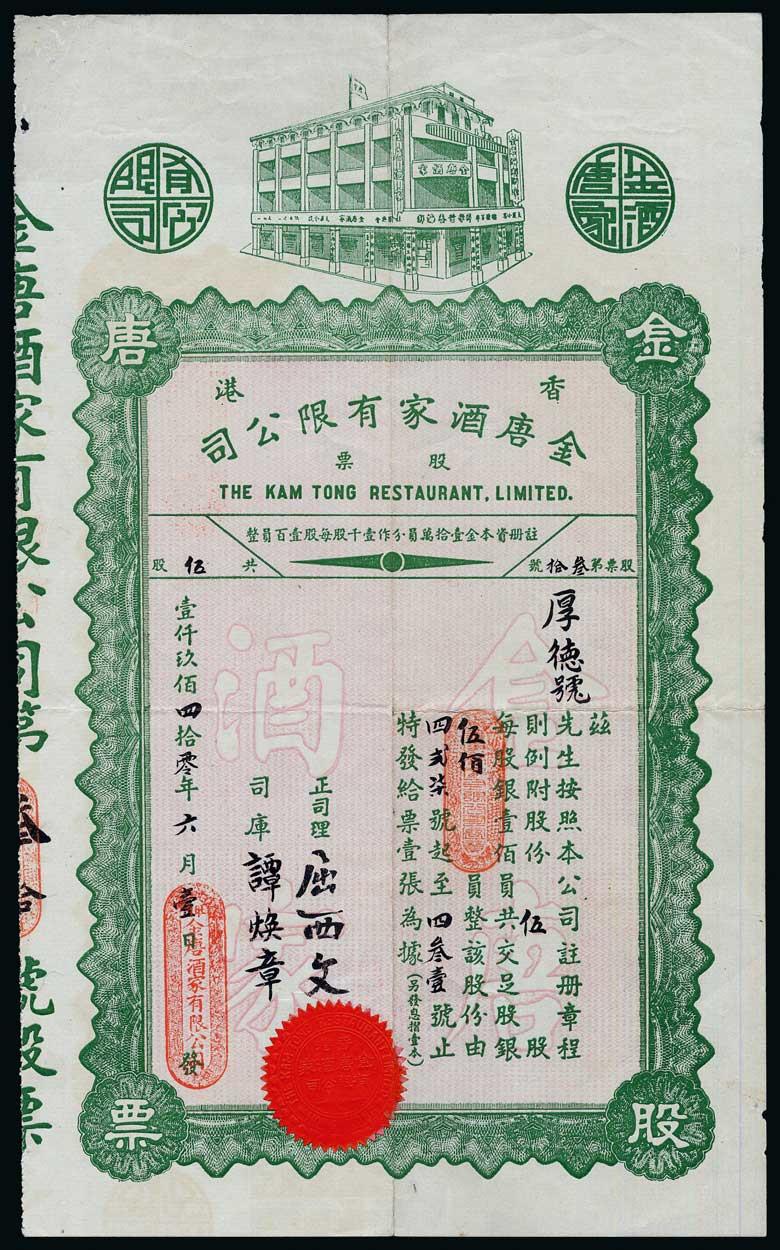 Kam Tong Restaurant Ltd., 100 yuan shares, 1940, vignette of 3 storey building at top, green, text in Chinese apart from title and in seal, red seal, red chops, very fine.