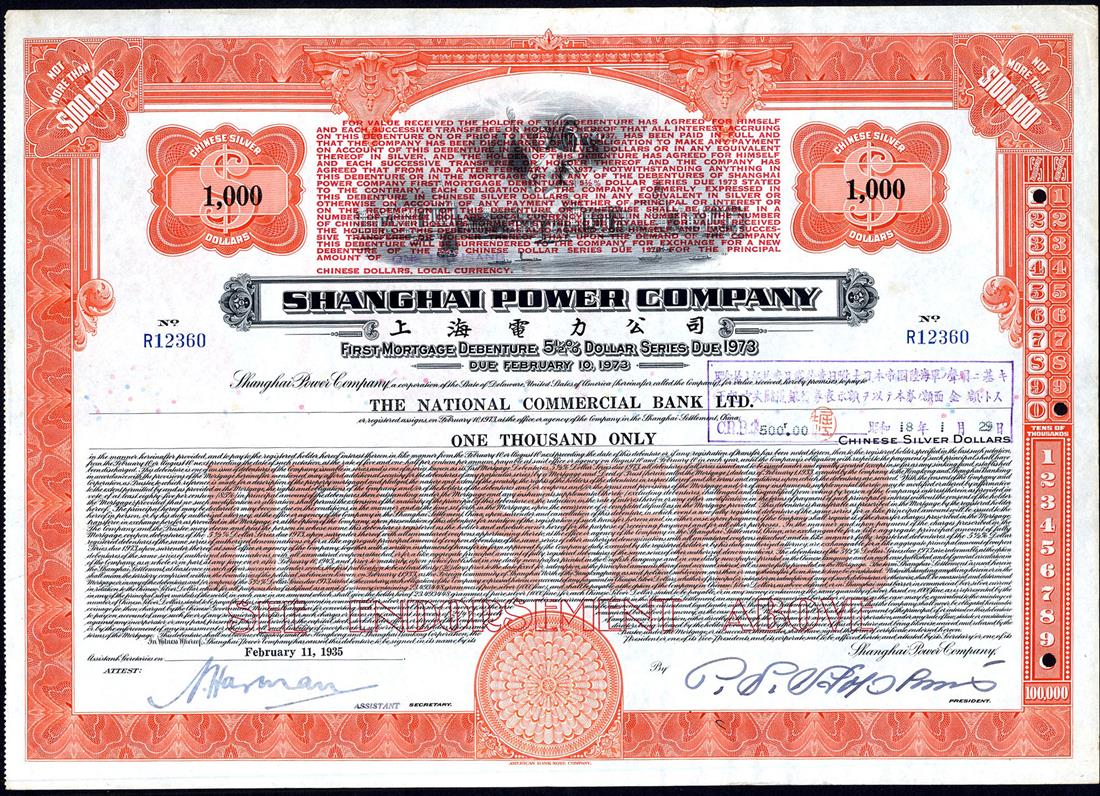 Shanghai Power Company, first mortgage 5½% debenture, printed denomination, C$1,000, [1935], no.R12360, vignette of Shanghai harbour but with red overprint across the entire view, red and black, printed by the American Bank Note Co., good very fine.
