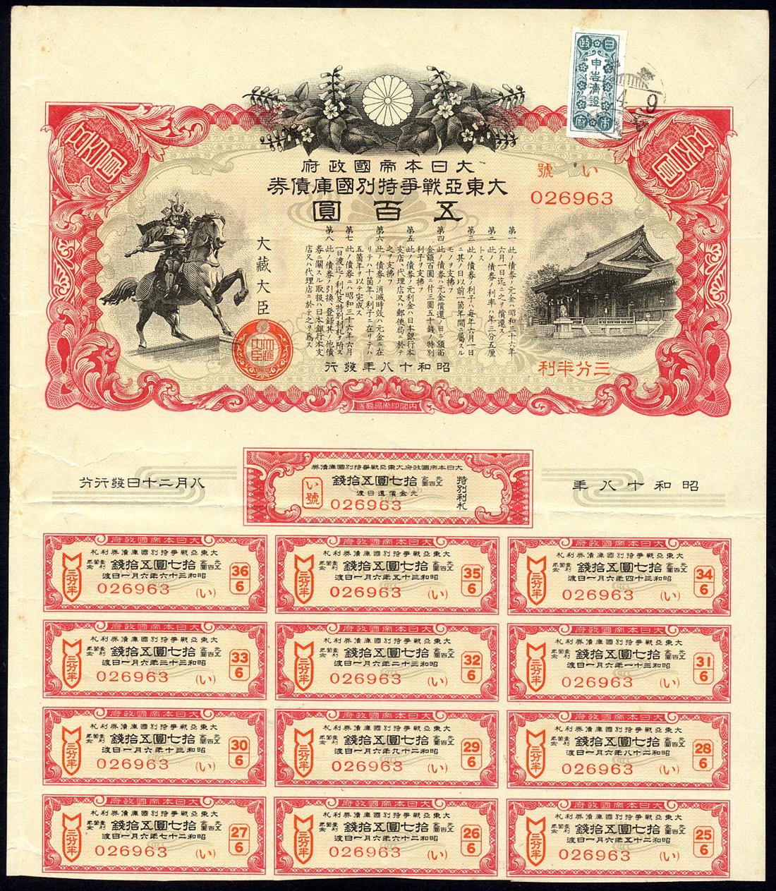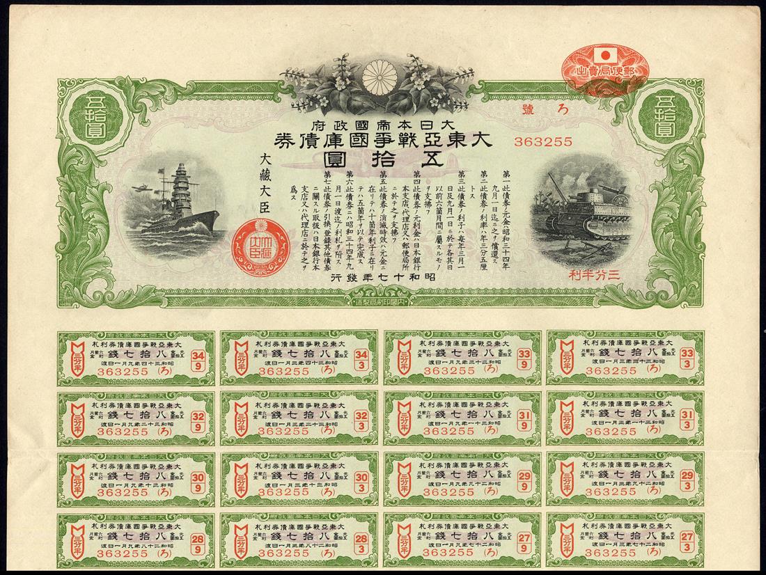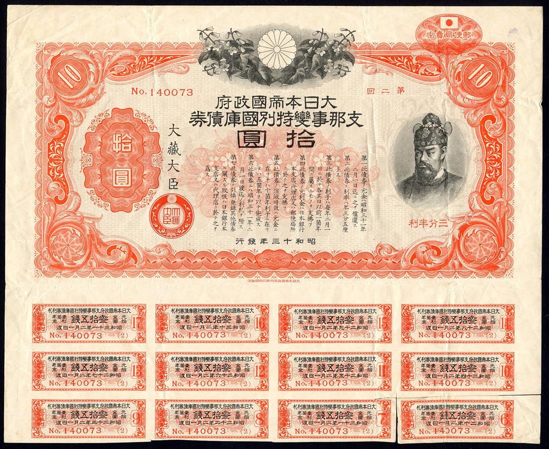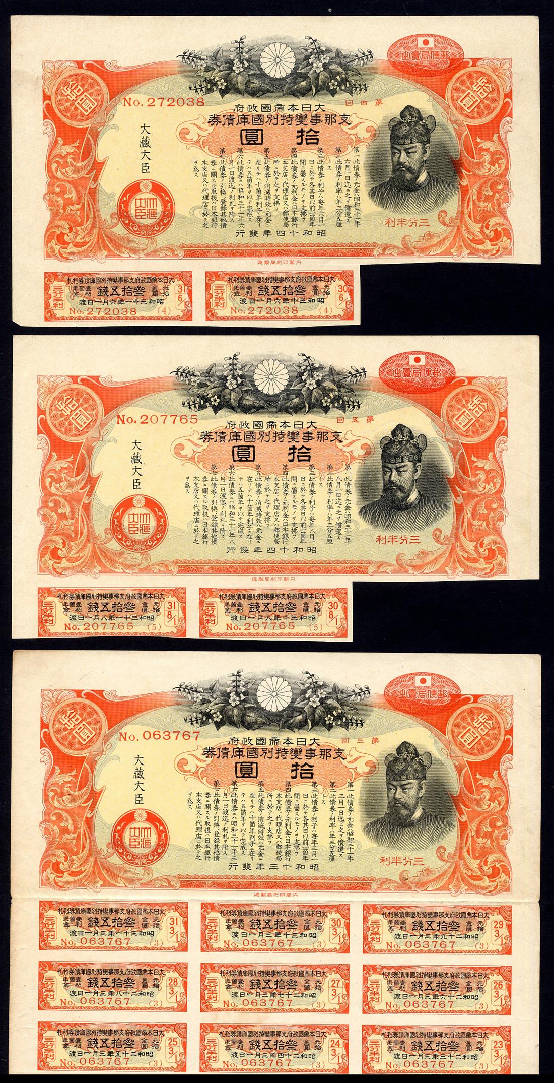 China Incident Special Treasury Bond, 10 yen, 1939, Fujiwara Kamatari at right, large format, and 10 yen, 1939/40 (3), smaller format, all orange, with coupons; together with a group of Greater East Asia War Treasury Bonds, 1941/42, 50 yen (6 different release dates and seals) and 100 yen (2), tank at right, battleship left, with coupons; Greater East Asia War Special treasury bond, 100 yen and 500 yen, 1944/5, statue of Kusunoki Masashige at left, Nanko-san Temple at right, with coupons, generally fine to very fine. (14)
