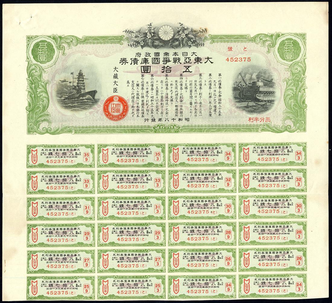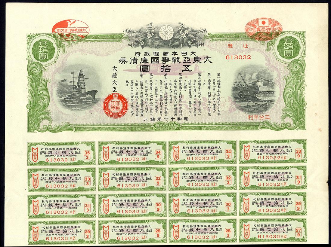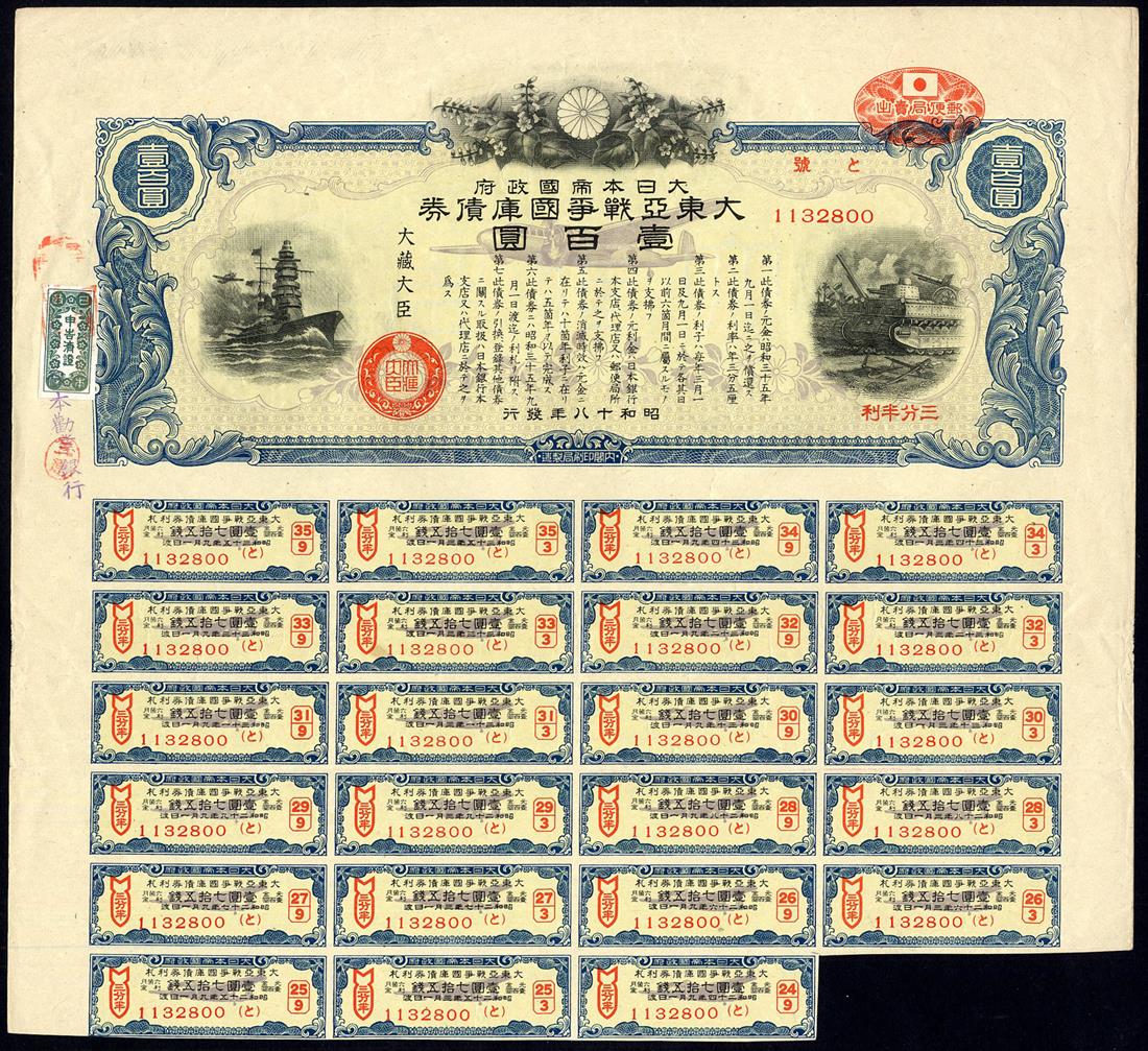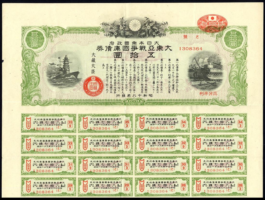 China Incident Special Treasury Bond, 10 yen, 1939, Fujiwara Kamatari at right, large format, and 10 yen, 1939/40 (3), smaller format, all orange, with coupons; together with a group of Greater East Asia War Treasury Bonds, 1941/42, 50 yen (6 different release dates and seals) and 100 yen (2), tank at right, battleship left, with coupons; Greater East Asia War Special treasury bond, 100 yen and 500 yen, 1944/5, statue of Kusunoki Masashige at left, Nanko-san Temple at right, with coupons, generally fine to very fine. (14)