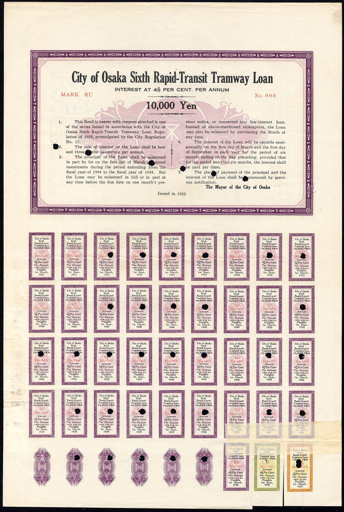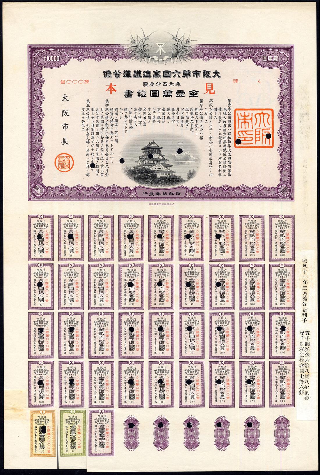 City of Osaka, Sixth Rapid-Transit Tramway Loan, 43/10%, 1935, a specimen bond for 10,000 yen, vignette of the 16th century Osaka Castle bottom centre, ornate border, mauve and black, text in Japanese with English translation on the reverse, numbered 000 in red, with coupons with 2 and 3 coupons replaced with one from specimens of the 5000 yen and 1000 yen bonds, hole cancelled, extremely fine.