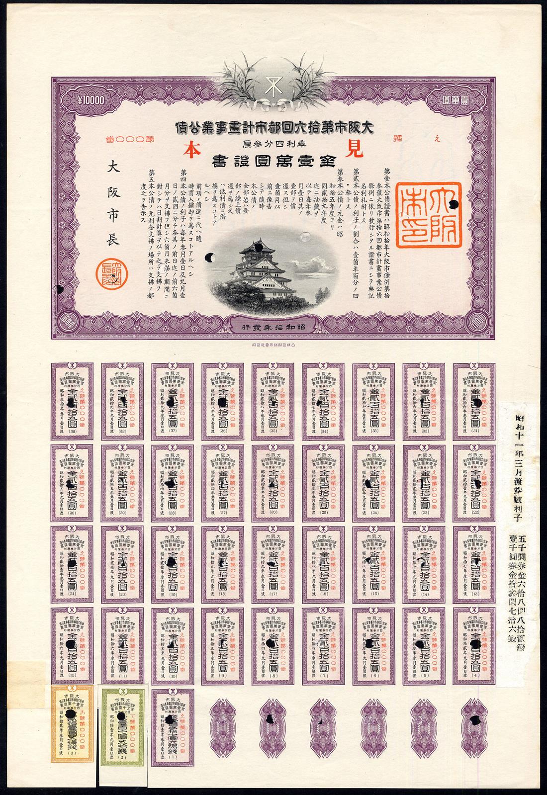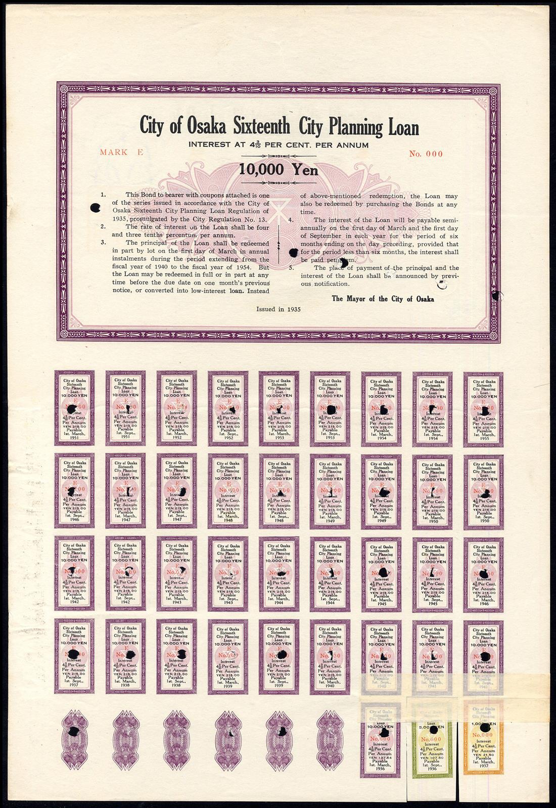 City of Osaka, Sixteenth City Planning Loan, 43/10%, 1935, a specimen bond for 10,000 yen, vignette of the 16th century Osaka Castle bottom centre, ornate border, mauve and black, text in Japanese with English translation on the reverse, numbered 000 in red, with coupons with 2 and 3 coupons replaced with one from specimens of the 5000 yen and 1000 yen bonds, hole cancelled, extremely fine.