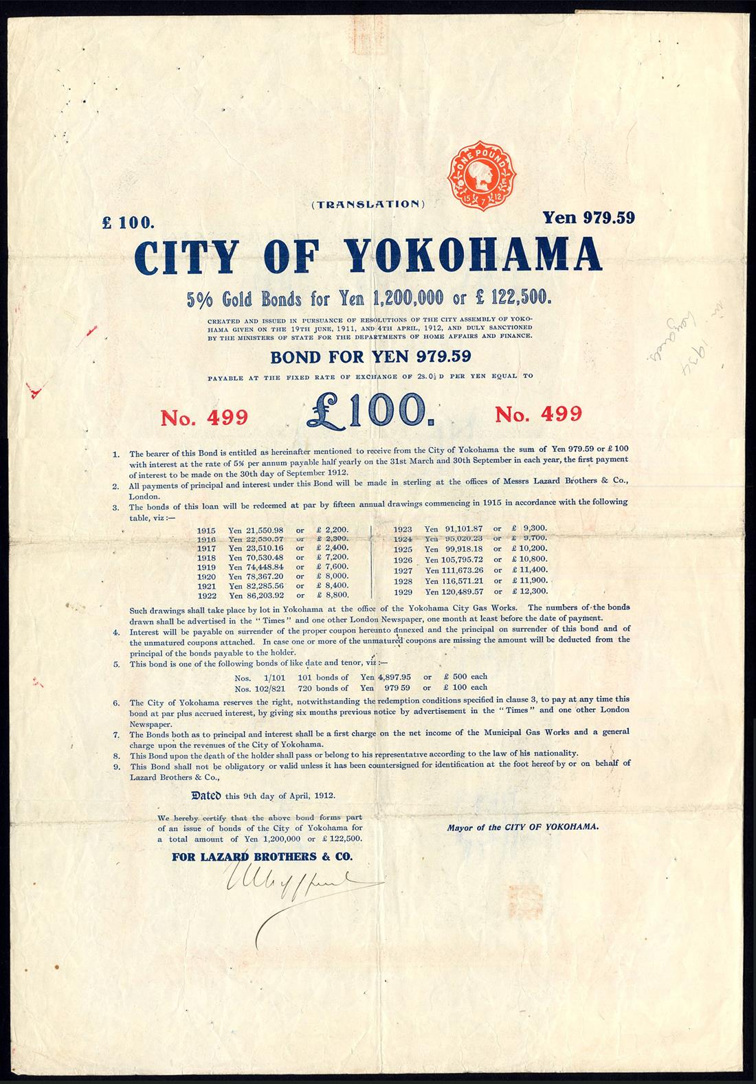 City of Yokohama, 5% Gold Loan, 1912, an extremely rare bond for £100, no.499 (of only 720 issued), large format piece with vignette of city roofline in centre, very ornate border, red and black, text all in Japanese with English on the reverse, English revenue stamp, with coupons from 1925, fine to very fine and rare. [R12]