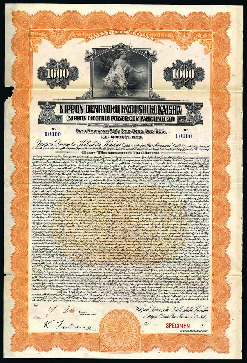 Nippon Electric Power Co. Ltd., First Mortgage 6½% Gold Loan, a specimen bond for $1000 from the American Bank Note Company archives, allegorical figure at top, ornate border, orange and black, with coupons, numbered 00000 and overprinted SPECIMEN in red, somewhat brittle with small piece missing from left edge, fine to very fine.