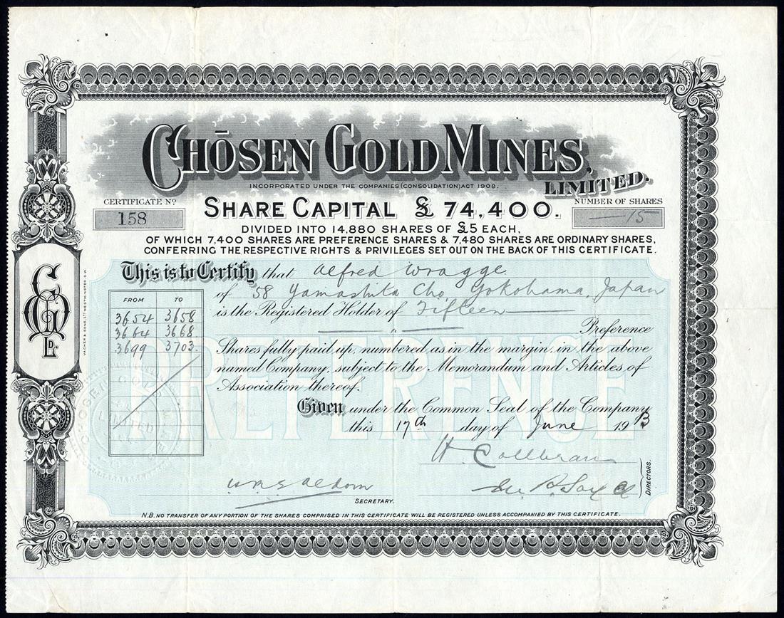 Chosen Gold Mines Ltd., £5 preference shares, 19[13], no.158, ornate border, blue and black, very fine and rare.