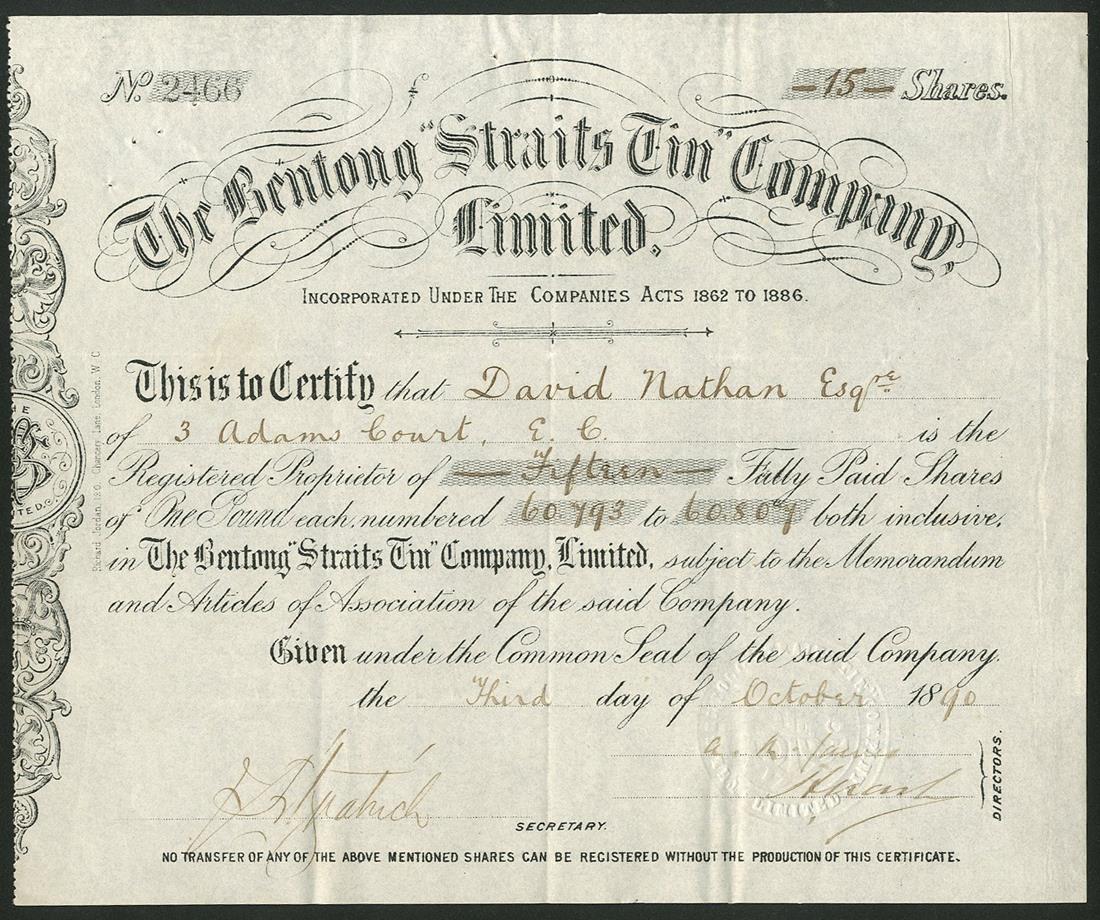 Malaya: A collection of English and Australian registered companies comprising Bentong Straits Tin Co. Ltd., £1 shares, 18[90], no.2466; Pahang Central Tin & Exploration Co. Ltd., bearer warrant for 25 shares of £1, 1890, no.354, with coupons; Pahang Exploration & Development Co. Ltd., £1 shares, 18[90], no.1624; Pahang Corporation Ltd., £1 ordinary shares, 18[99], no.18753; Pahang-Kabang Ltd., £1 ordinary shares, 190[4], no.3186; Kledang Tin Mining Co. Ltd., £1 shares, 190[7], no.1078 and 10/- shares, 191[0], no.267; Seremban Tin Mining Co. Ltd., £1 shares, 19[16], no.86; Huey Yot Tin Dredging Ltd., 3 different types, 1926 and 1929; Ampang (Perak) Tin Dredging Ltd., 19[26], and, Temegor Tin Mining Co. Ltd., [1929], generally very fine or thereabouts, some scarce. (13)