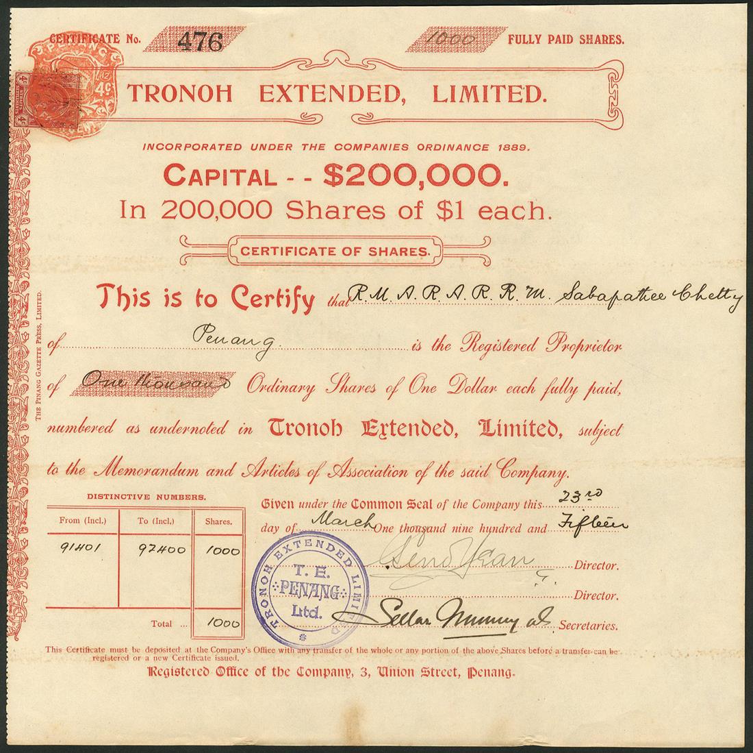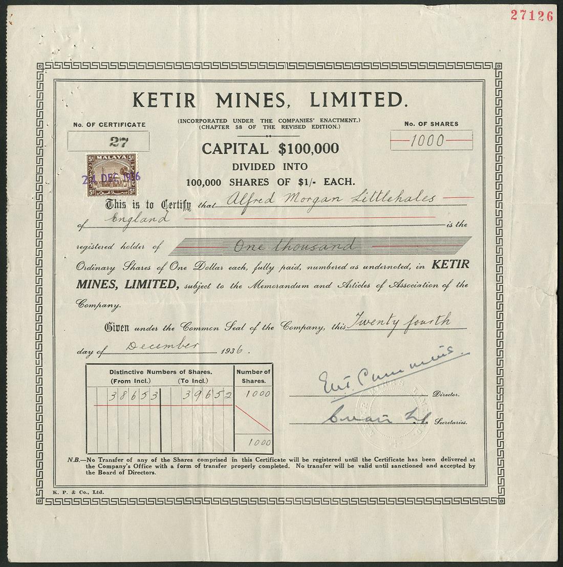 Ketir Mines Ltd., $1/- shares, 193[6], no.27, ornate border, black on grey paper, adhesive Malaya revenue stamp, together with another scarce locally registered piece, Tronoh Extended Ltd., $1 shares, 19[15], no.476, red, adhesive Straits revenue stamp tied with a red embossed Penang duty stamp, very fine and about extremely fine. (2)
