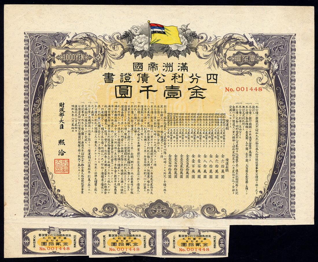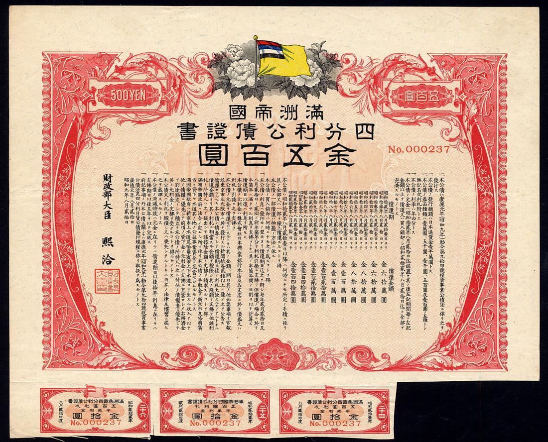 Manchukuo; Imperial 4% Public Loan, bonds for 500 yen, and 1000 yen, Showa 9 (1934), multicoloured vignette of flag, ornate border, red and black, and blue-grey and black, with coupons, good very fine. (2)