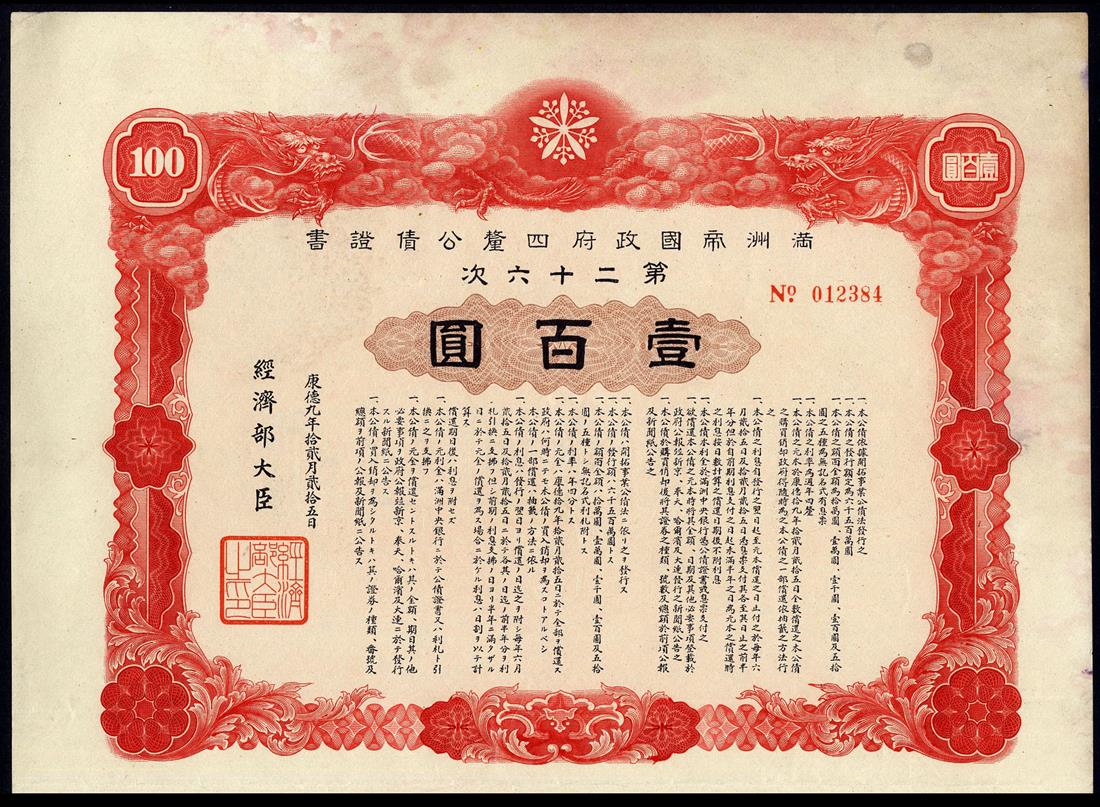 Imperial Manchou Government 4% Public Loan, 2nd series, a group of bonds comprising 50 yen, release 24, K'ang Te 9 (1940), 2 examples,one with hole cancellation and one without coupons, 100 yen, release 26, K'ang Te 9 (1940), ornate borders with dragons at top, blue and red respectively, with coupons, very fine. (3)