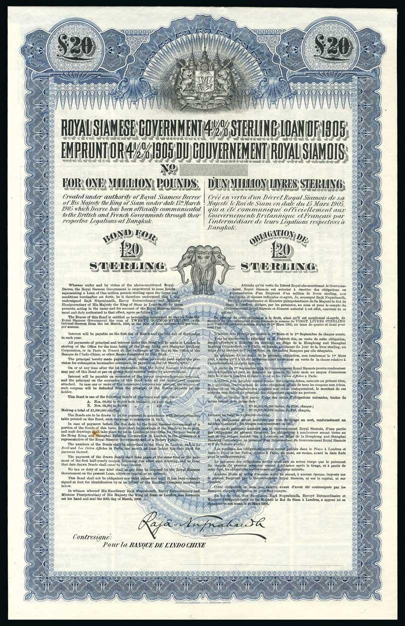 Royal Siamese Government 4½% Sterling Loan of 1905, unissued bond for £20, countersigned by the Banque de L'Indo Chine, Siamese arms at top, elephants in centre, blue and black, printed by Bradbury, Wilkinson & Co., with full coupon sheets, not numbered, extremely fine and rare. [R10]