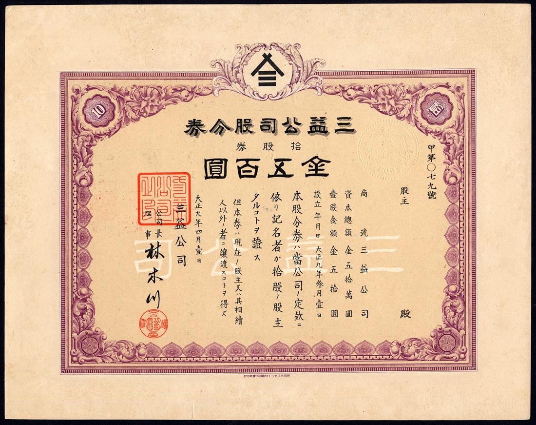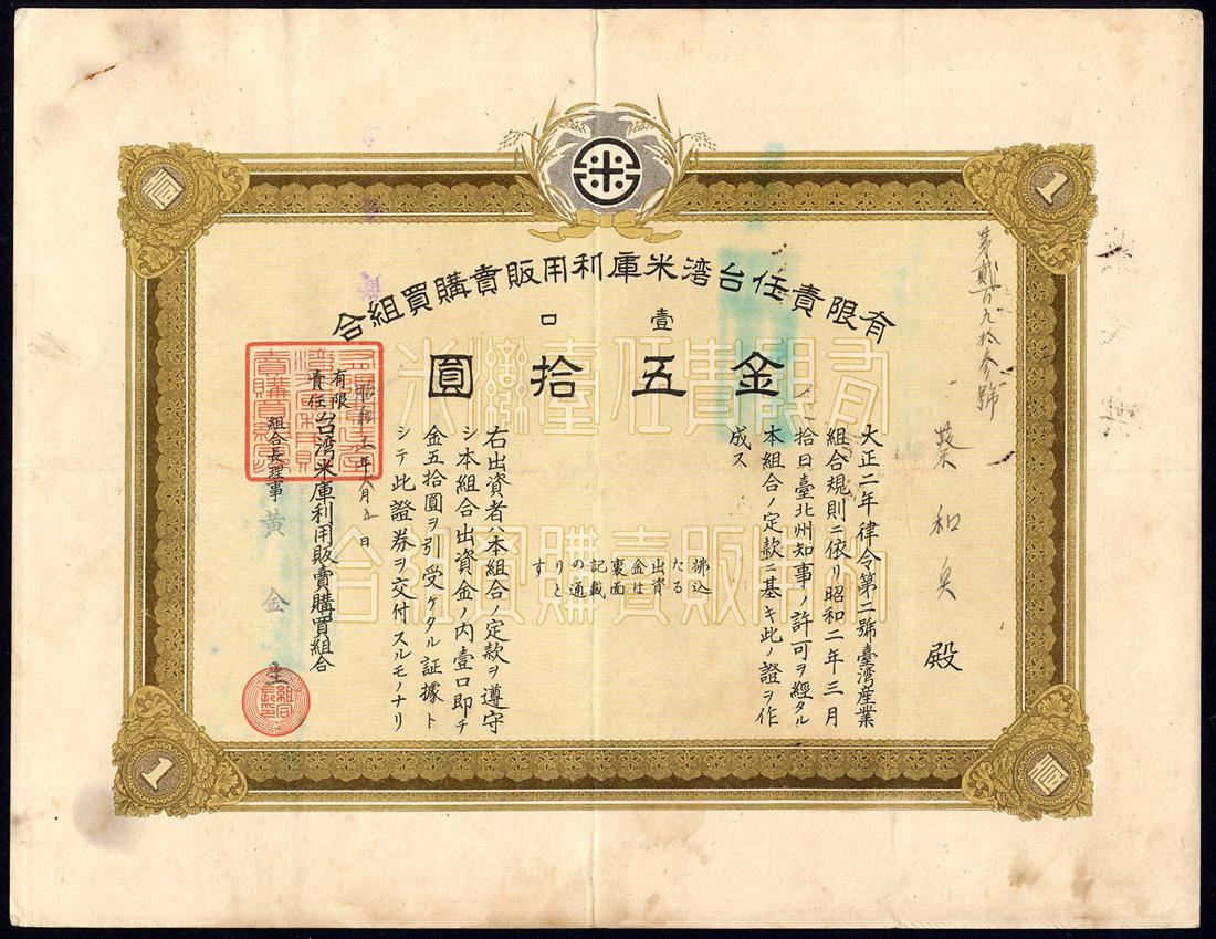 Taiwan: A small collection of certificates comprising,Cereals and Tobacco San Yi Joint Stock Co., 10 shares and 100 shares, 1920; Yang Mi Li Credit Co., 20 yen bond, 1919; Taiwan Rice Storage & Consumers Cooperative Association, 50 yuan, 1936; Yang Cheng Ltd., 1, 10 and 100 shares of 50 yan, 1950, and, Pioneer Co. Ltd., 10 shares of 50 yuan, 1934, attractive piece with vignette of the Island at top; together with other Japanese influence certificates from Taiwan and Manchukuo (5), mostly very fine and better (13)