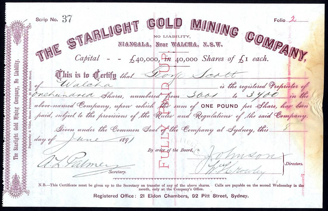 A small group of Australian certificates, comprising Australian Mines Agency Ltd., bearer warrant for100 shares of £1, 189[6], no. 3105, green and brown, with coupons; West Australian Minerals and Finance Co. Ltd., 5 shares of £1, 18[95], no.1945, black and green, with coupons; Starlight Gold Mining Co. NL, Niangala, NSW, £1 shares, 189[1], purple printing, some damp staining/creasing at right edge, 4 examples; Slough Creek Ltd., 25 shares of 4 shillings, 190[7], no.137, large format, green, with coupons, and, Associated Financial Corporation Ltd., 5/- shares, 190[3], black, 3 examples, very fine to extremely fine unless stated. (10)