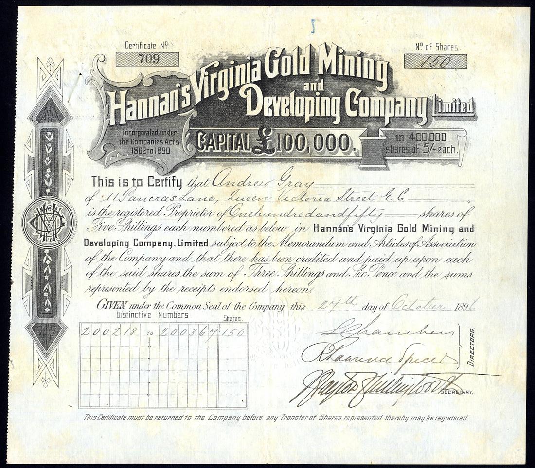An accumulation of mostly Western Australian gold mining certificates (27), comprising, Hannan's Virginia Gold Mining & Developing Co. Ltd., 1896; Blacketts Gold Mines Ltd., 1896; Consolidated Gem Group of Murchison Gold Mines Ltd., 1896; Websters Gold Mining Co. Ltd., 1901; Weld Hercules Gold Mines Ltd., 1899 to 1900, 6 examples; Chaffers Gold Mining Co. Ltd., 1909, 2 examples; Lake View Extended Gold Mine (W.A.) Ltd., 1901; Rosenblock Twin Reefsold Mining Co. Ltd., 1897; North Star Gold Mines Ltd., 1901/1902, 2 examples; Sherlaws Gold Mining Co. Ltd., 1901; McKenzie Gold Mines Ltd., 1896; Transvaal-Westralian Gold Concessions Ltd., 1896; Mutual Exploration, Finance & Underwriting Corporation Ltd., 1897; Bathurst Gold Mines Ltd., 1896, 3 examples and options and transfers (4), all are affected by damp with some discolouration and thinning but some scarce titles included, many fine and better. (27)