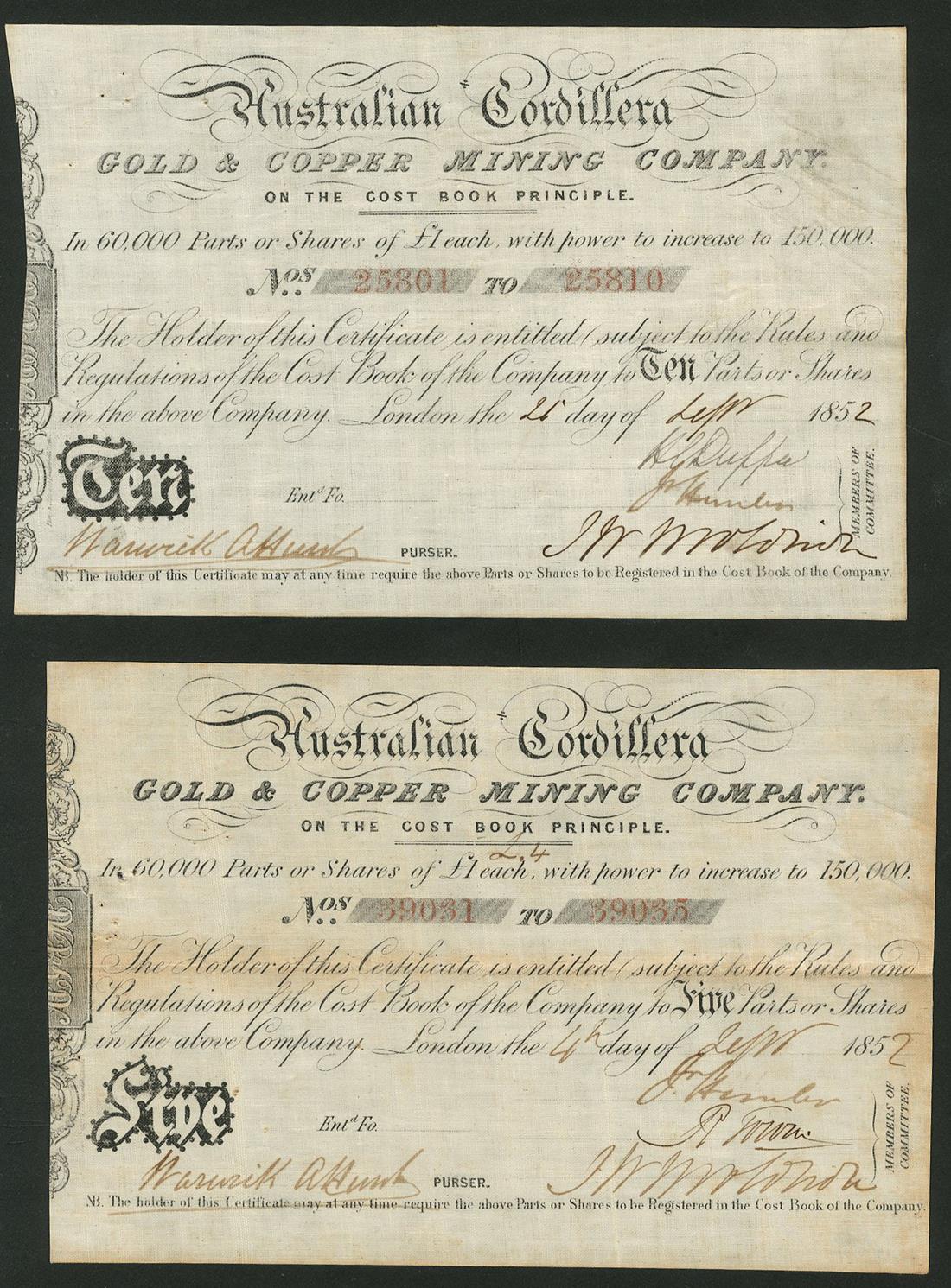 Australian Cordillera Gold & Copper Mining Co., a pair of certificates for 5 and 10 shares of £1, both 185[2], decorative title, black, printed on linen, red serial numbers, some toning on the first otherwise good very fine. (2)