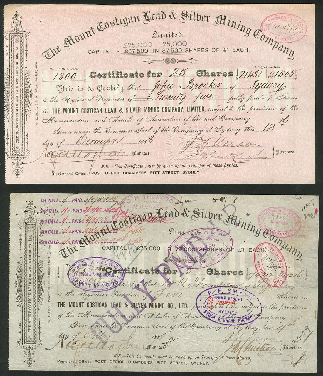 Mount Costigan Lead & Silver Mining Co. Ltd., a small group of certificates for £1 shares, fully paid, 188[8] and 188[9], with capital of £37,500 crossed out and revised capital of £75,000 stamped above, black with pink underprint (8), and 15/- paid, all 188[8], black with green underprint (11), many have hand stamps on face, fine to very fine, some better. (19)