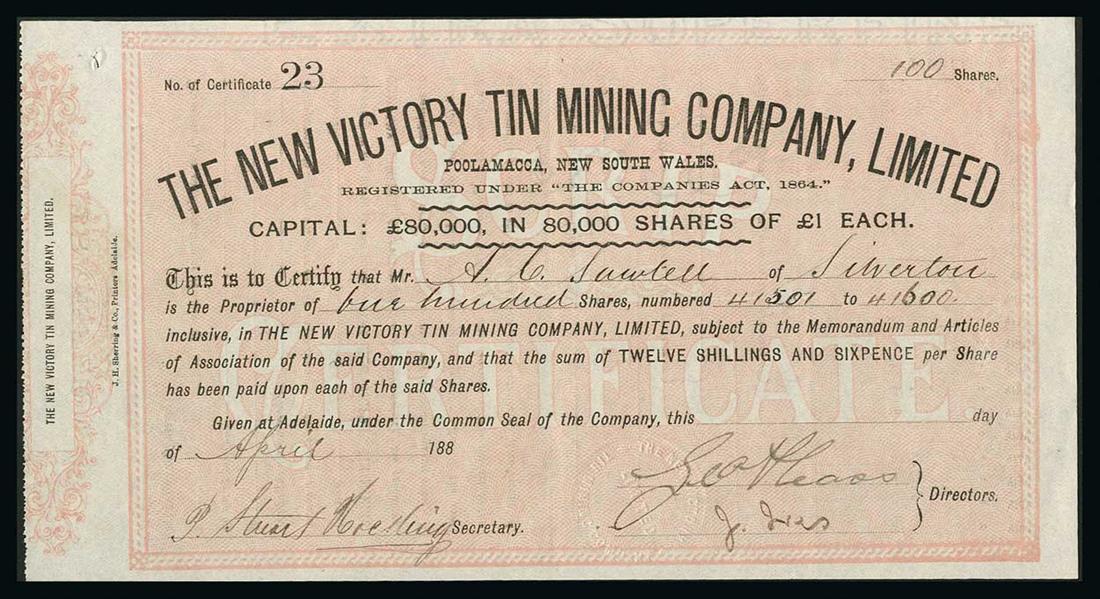 New Victory Tin Mining Co. Ltd., a group of certificates for £1 shares, 12/6d paid, 5 examples and fully paid, 2 examples, all 188(8), all low numbers, black, pink underprint, generally extremely fine. (7)