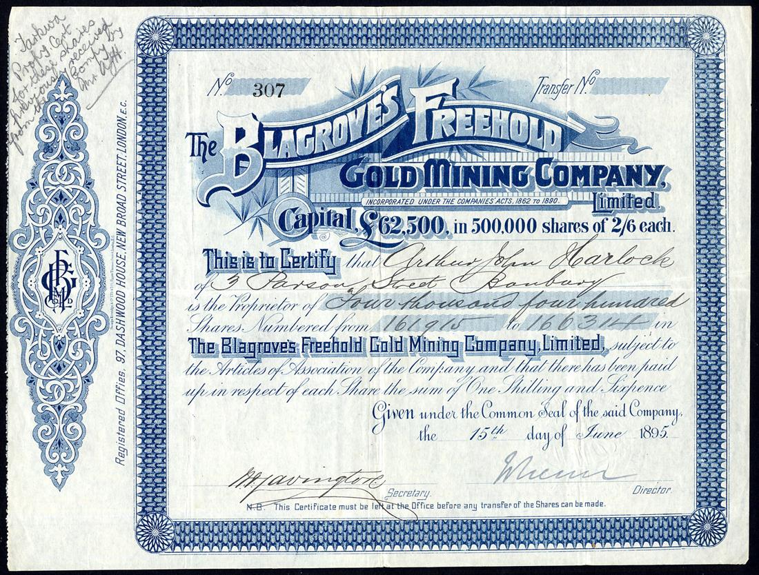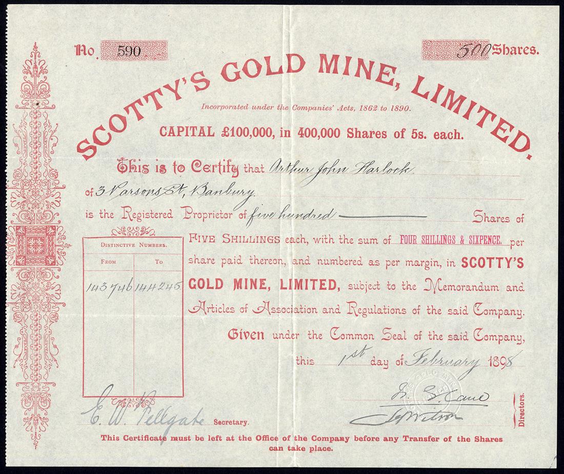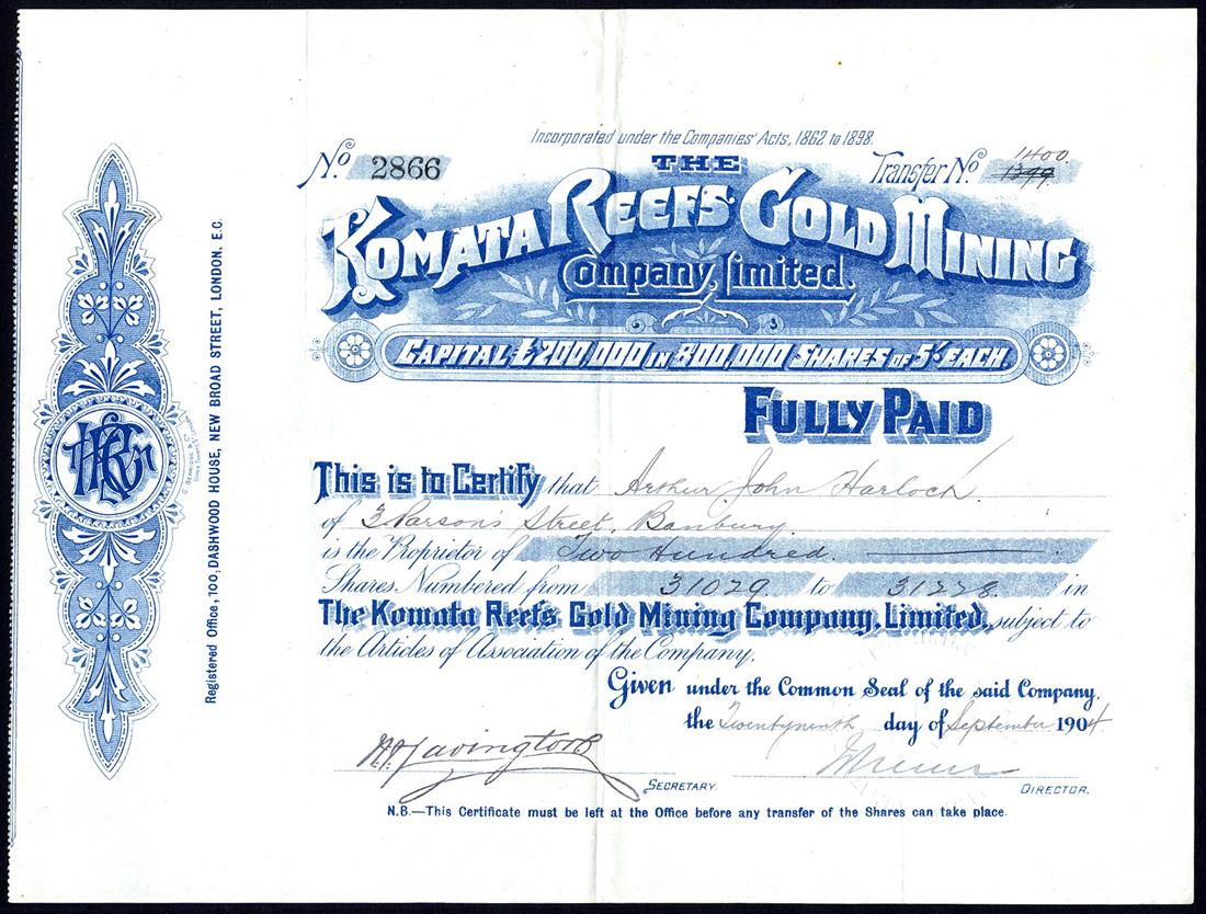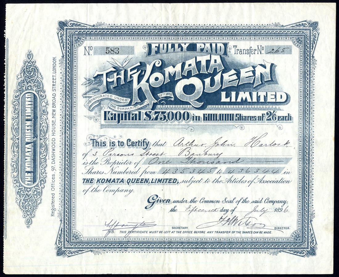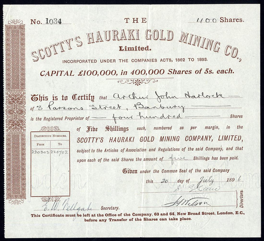 New Zealand: A good lot of Mining certificates (11), comprising Scotty's Hauraki Gold Mining Co. Ltd., 1896; Scotty's Gold Mine Ltd., 1898, 2 examples; Komata Queen Ltd., 1896; Blagroves Freehold Gold Mining Co. Ltd., 1895, and Komata Reefs Gold Mining Co. Ltd., 6 examples dated 1902 to 1904, generally very fine. (11)
