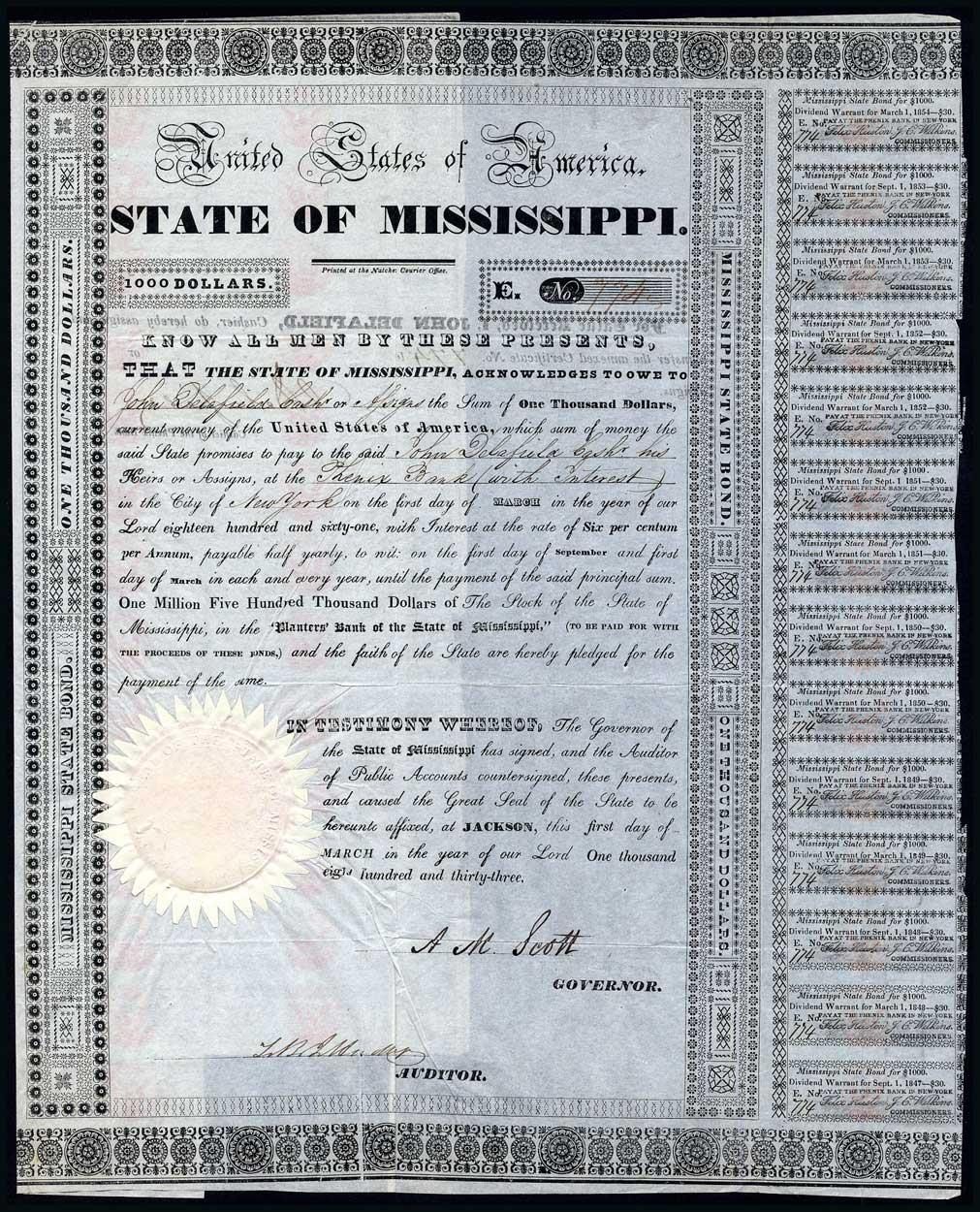 State of Mississippi, 6% 'Planters' Bank' Loan, 1833, bond for $1000, series E, redeemable 1861, no.774, signed by the Governor, A.M.Scott, attractive engine turned borders, black, with coupons, also with coupon sheet for obtaining interest payments in London, very fine.