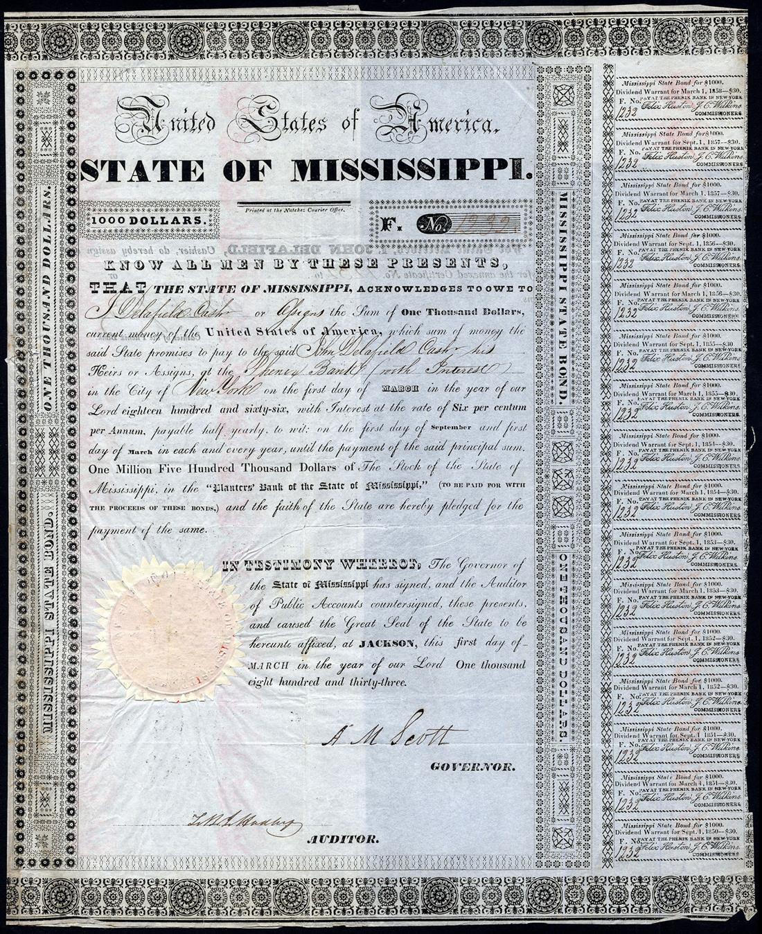 State of Mississippi, 6% 'Planters' Bank' Loan, 1833, bond for $1000, series F, redeemable 1866, no.1232, signed by the Governor, A.M.Scott, attractive engine turned borders, black, with coupons, also with coupon sheet for obtaining interest payments in London, small split at right, very fine.