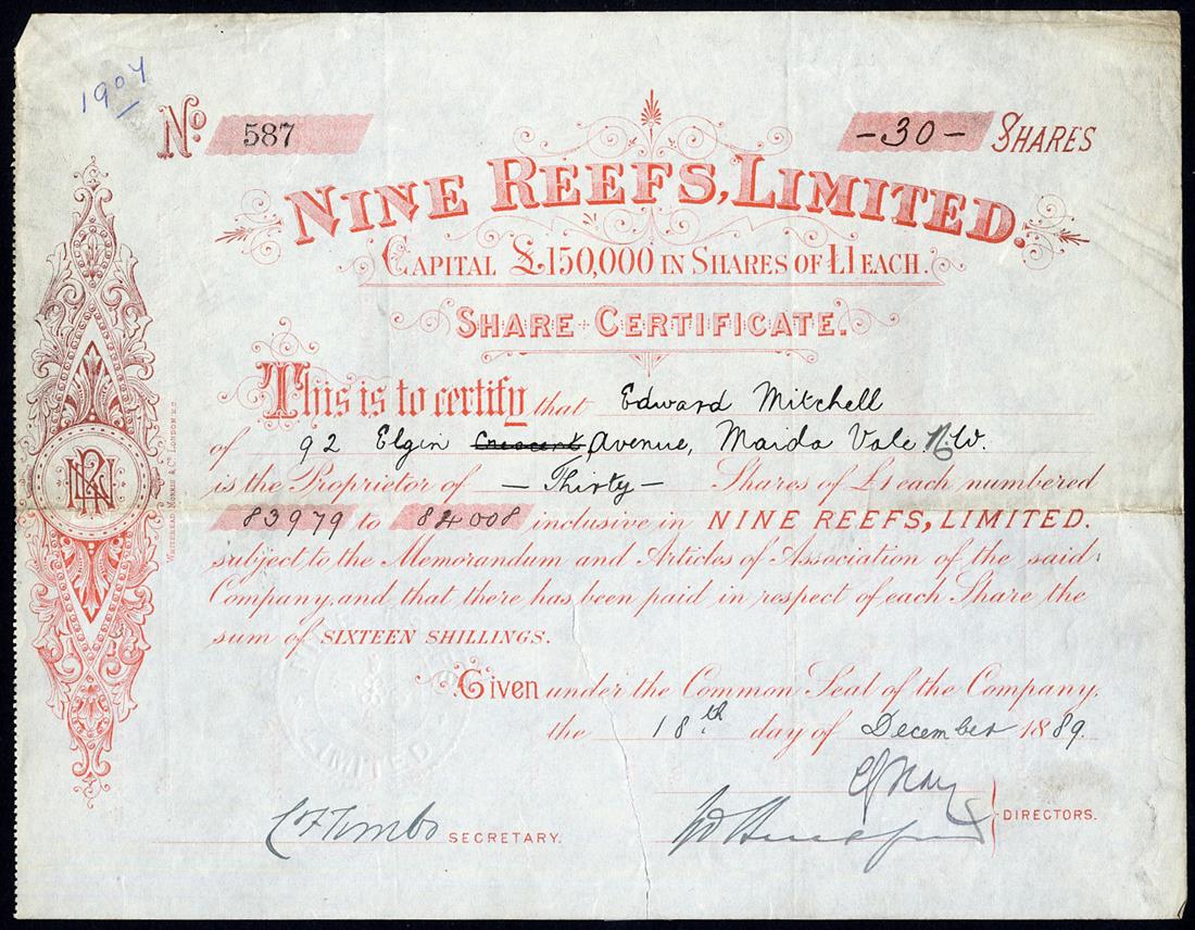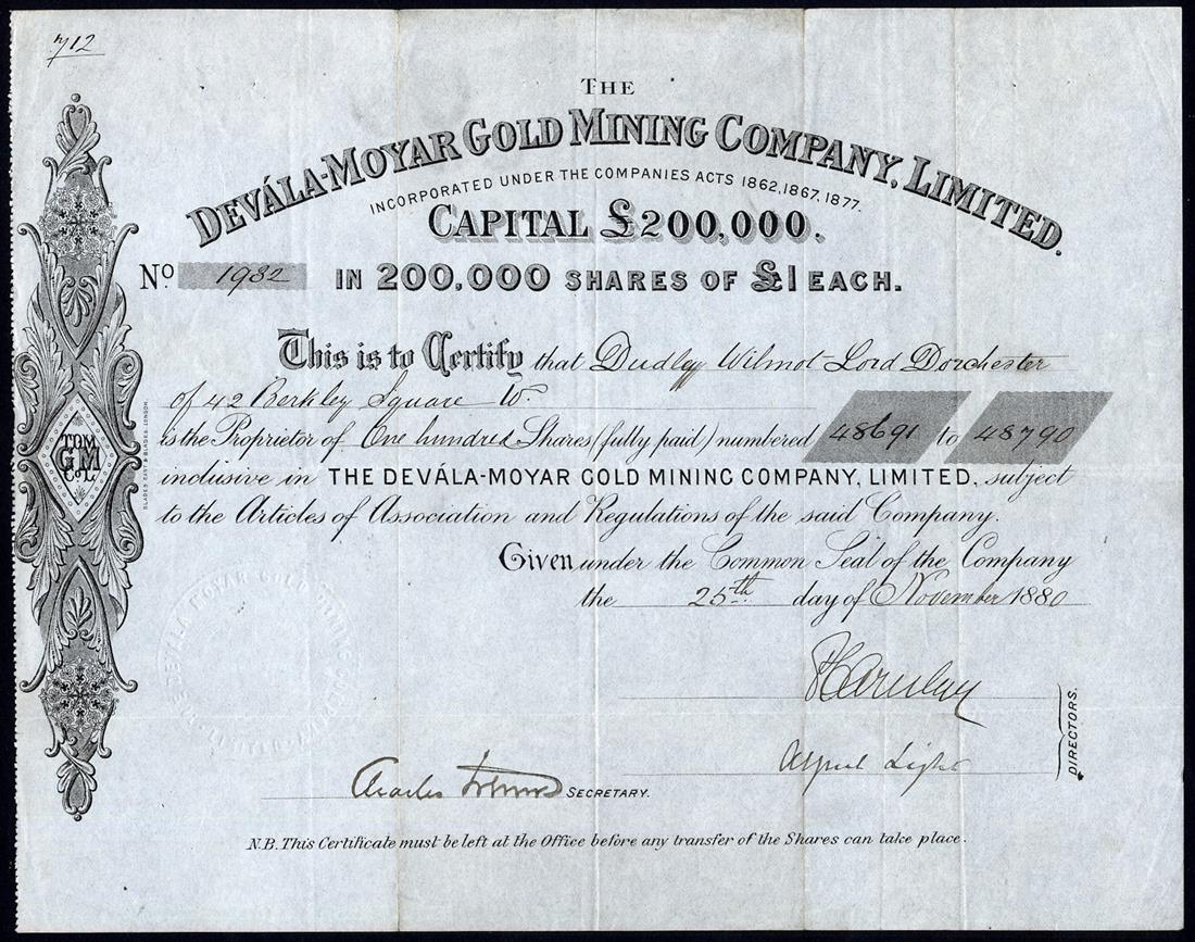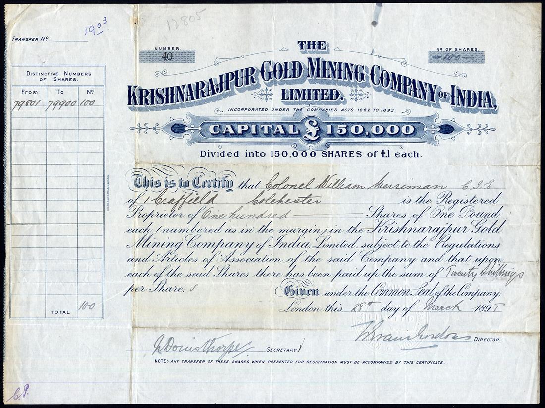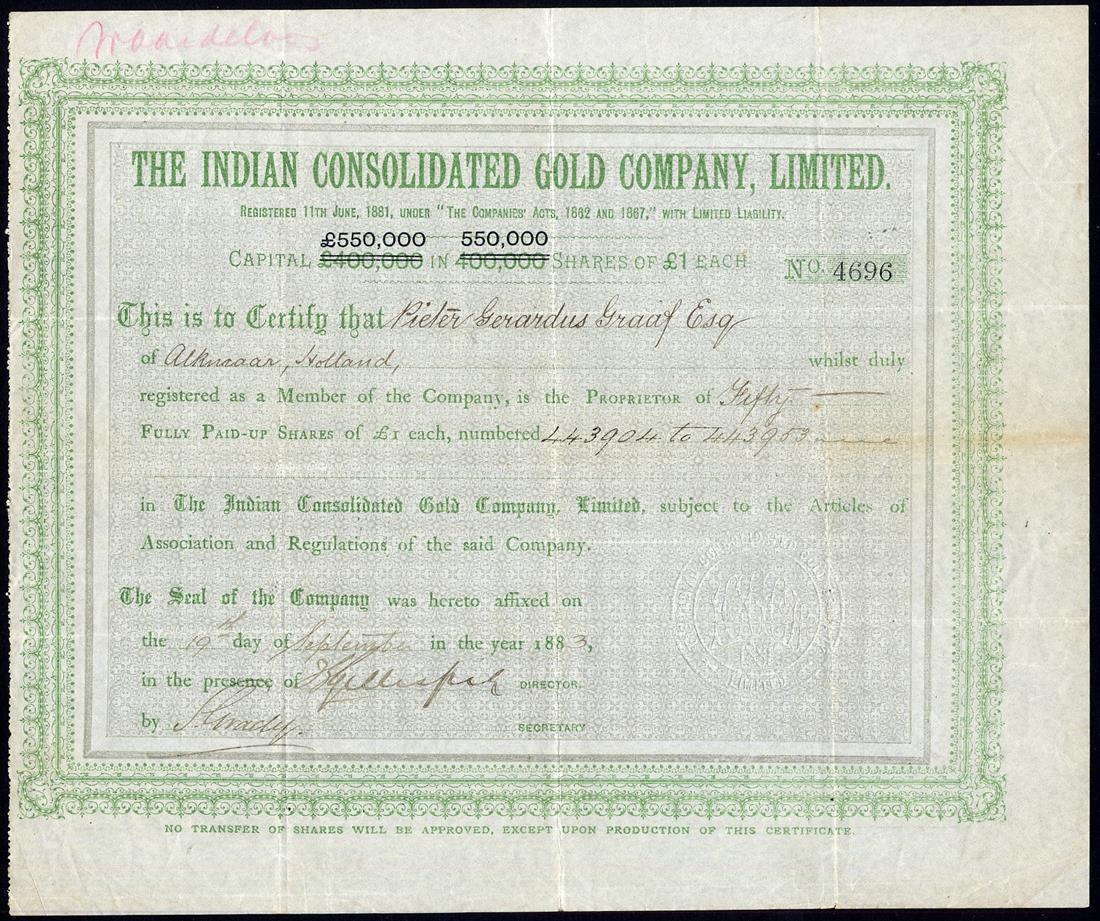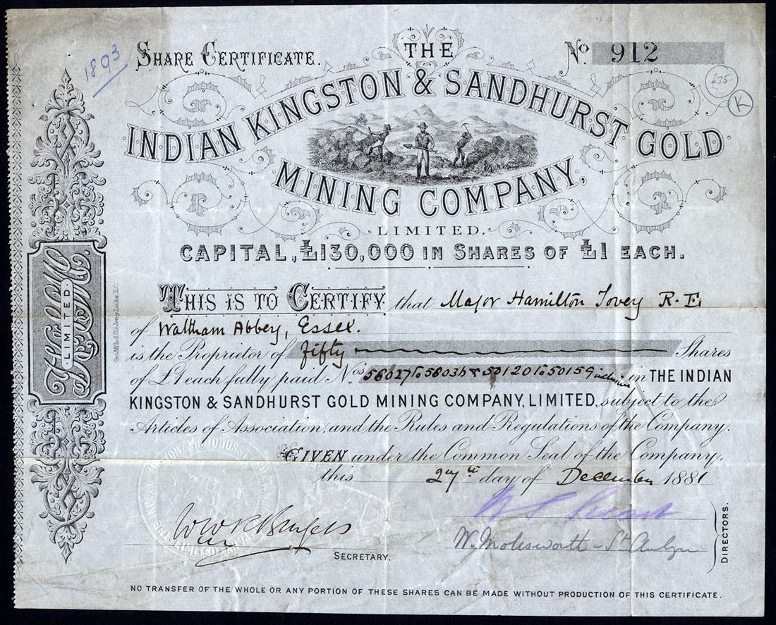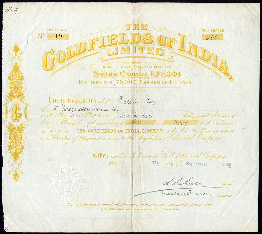 A small Collection of British Companies mining gold in South India, comprising Indian Kingston & Sandhurst Gold Mining Co. Ltd., £1 shares, 188[1], no.912, vignette of miners at work, black; Central Wynaad Gold Mining Co. Ltd., £1 shares, 18[81], no.108; Devala-Moyar Gold Mining Co. Ltd., £1 shares, 188[0], no.1982; Nine Reefs Ltd., £1 shares, 18[89], no.587, and Indian Consolidated Gold Mining Co. Ltd., £1 shares, 188[3], no.4696, capital overprinted, together with Krishnarajpur Gold Mining Co. of India Ltd., £1 shares, 189[8], no.40 and Goldfields of India Ltd., £1 shares, [1896], no.19, mixed condition, generally fine and very fine. (7)