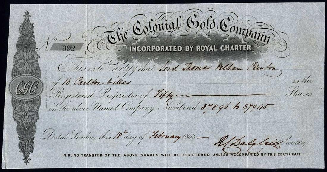 Colonial Gold Company, share certificate, London 1853, no.392, scrollwork and monogram left, black, very fine and rare.