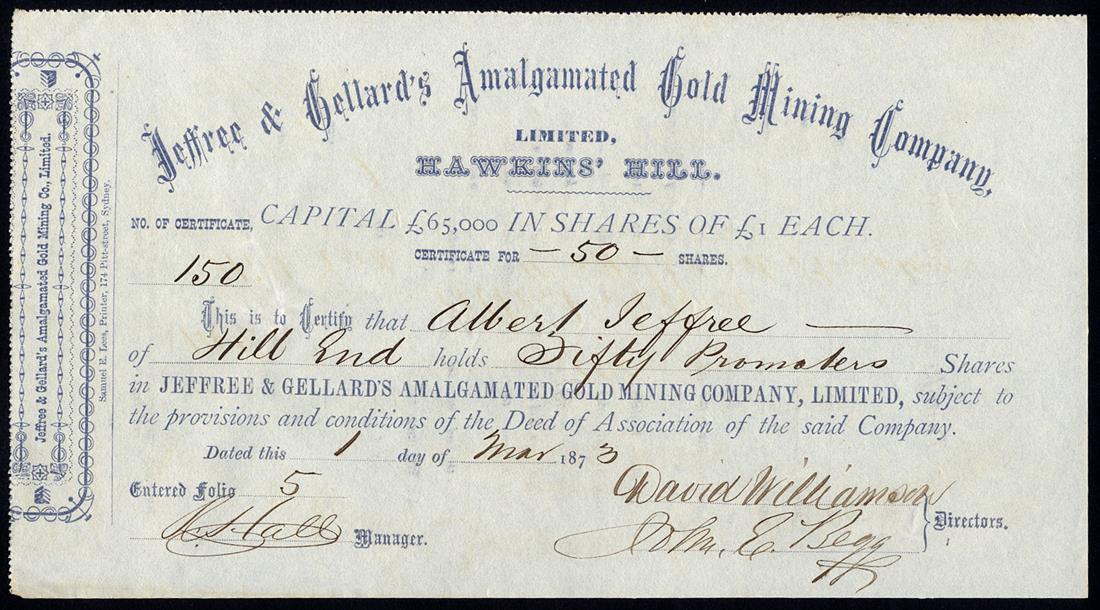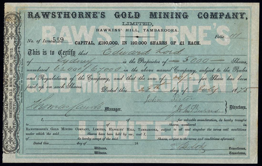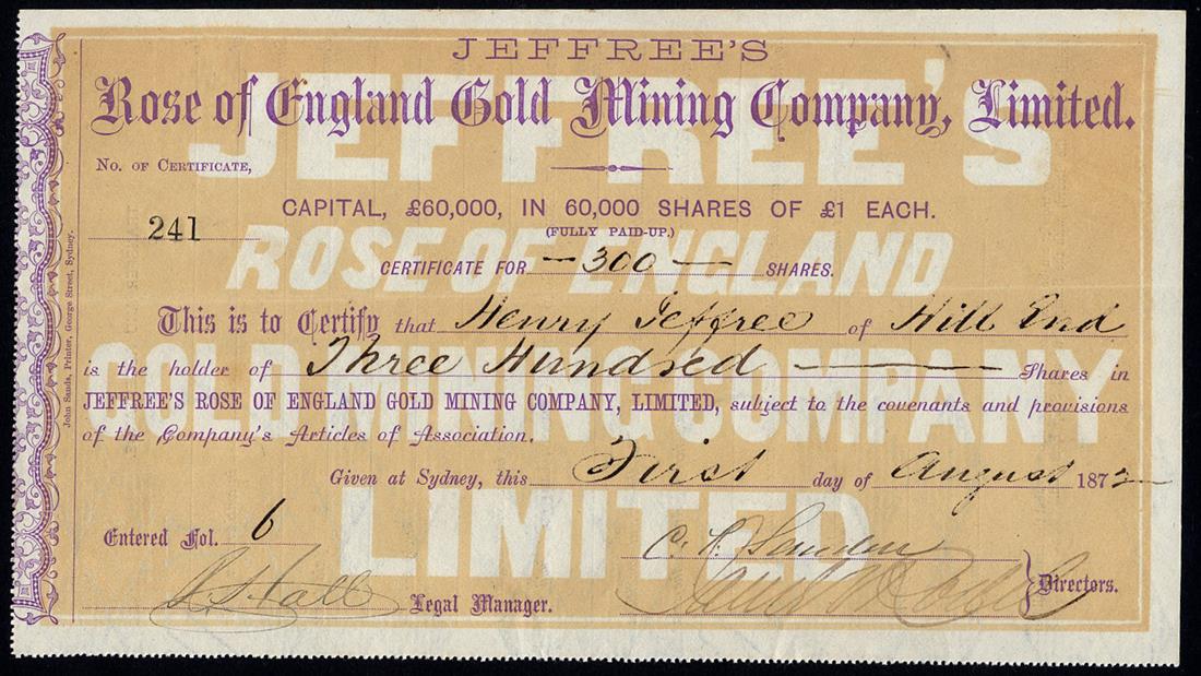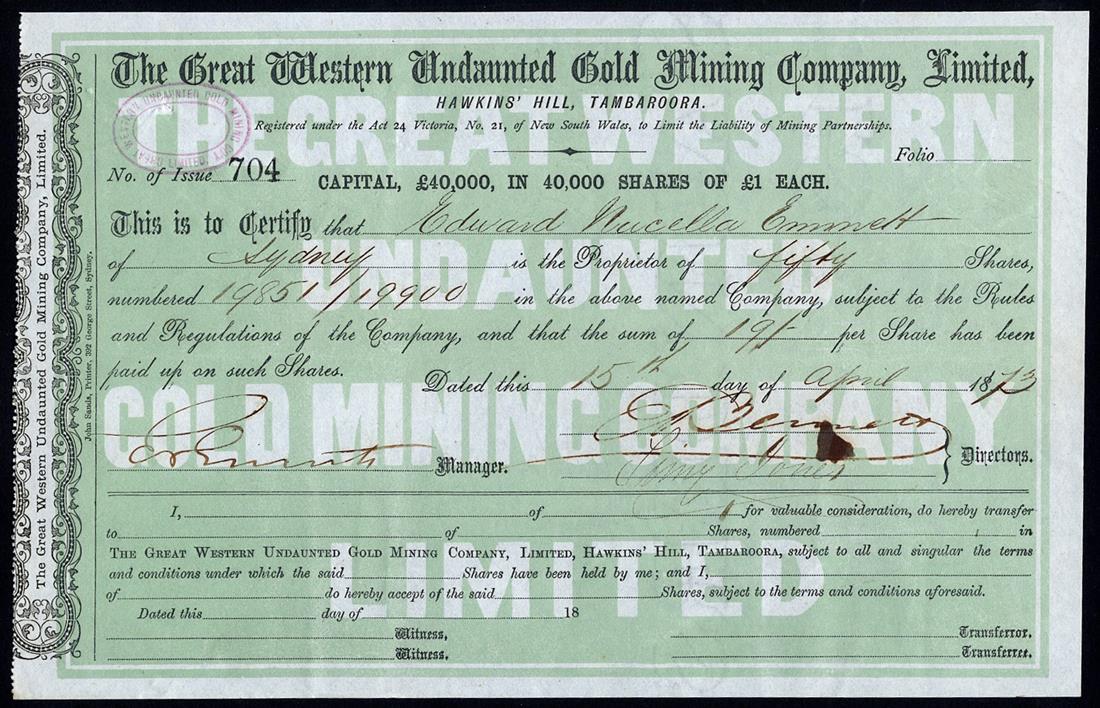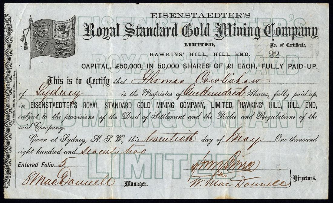 New South Wales: A group of companies from the 1870's Mining Boom at Hawkins' Hill, comprising Eisenstaedter's Royal Standard Gold Mining Co. Ltd., £1 shares, 18[72], no.22, flag top left; Great Western Undaunted Gold Mining Co. Ltd., £1 shares, 18[73], no.704, small ink mark; Jeffree & Gellard's Amalgamated Gold Mining Co. Ltd., £1 shares, 187[3], no.150; Rawsthorne's Gold Mining Co. Ltd., £1 shares, 18[75], no.559, and Jeffree's Rose of England Gold Mining Co. Ltd., £1 shares, 187[2], no.241, an attractive lot, very fine and better. (5)