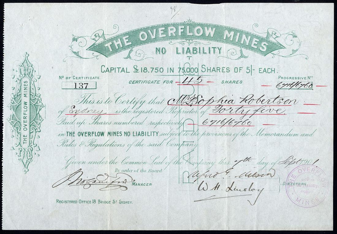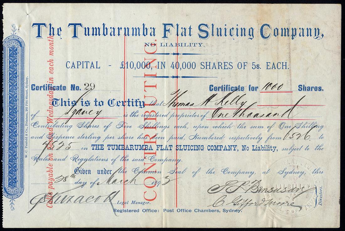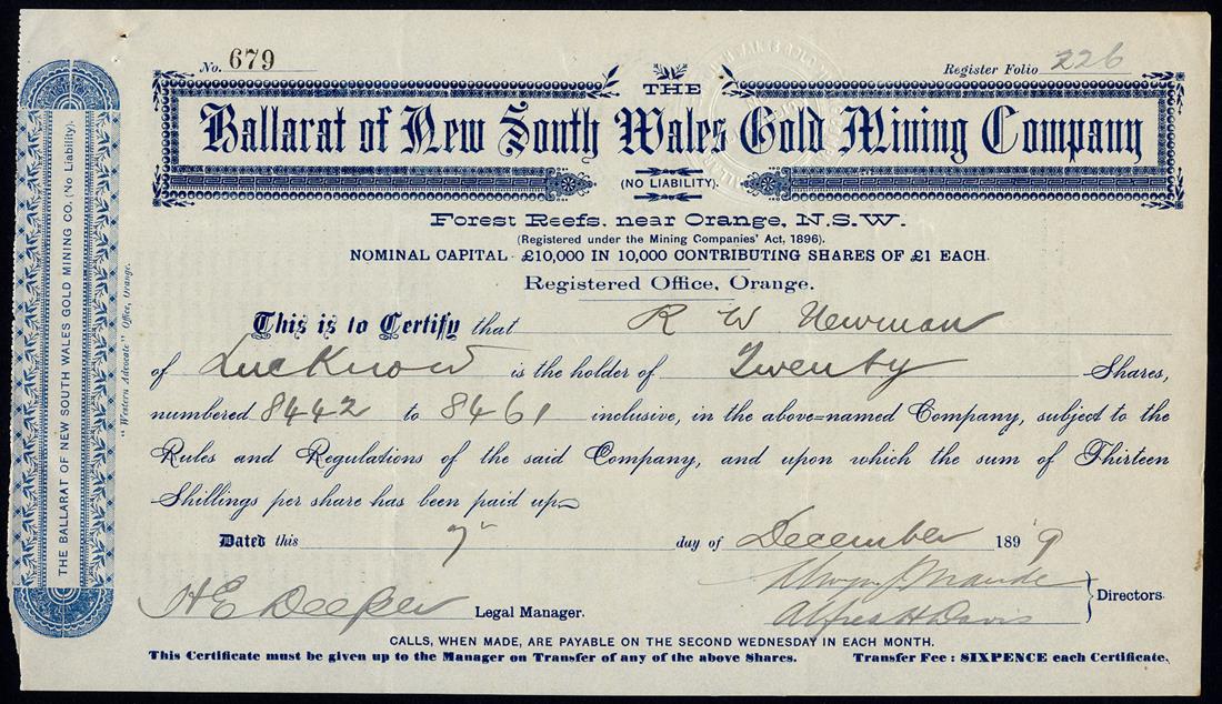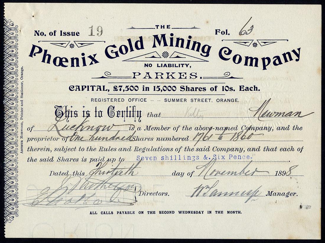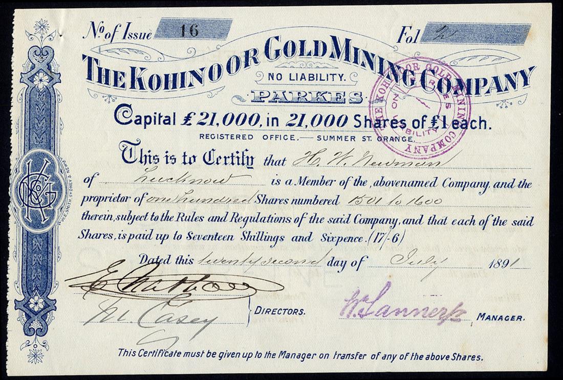 New South Wales: A small group of Locally Registered Companes, comprising Ballarat of New South Wales Gold Mining Co. NL, Forest Reefs, £1 shares, 189[9], no.679; Kohinoor Gold Mining Co. NL, Parkes, £1 shares, 189[1], no.16; Overflow Mines NL, 5/- shares, 190[1], no.137; Phoenix Gold Mining Co. NL, Parkes, 10/- shares, 189[8], no.19; Tumbarumba Flat Sluicing Co. NL, 5/- shares, 189[2], no.29, very fine and better. (5)