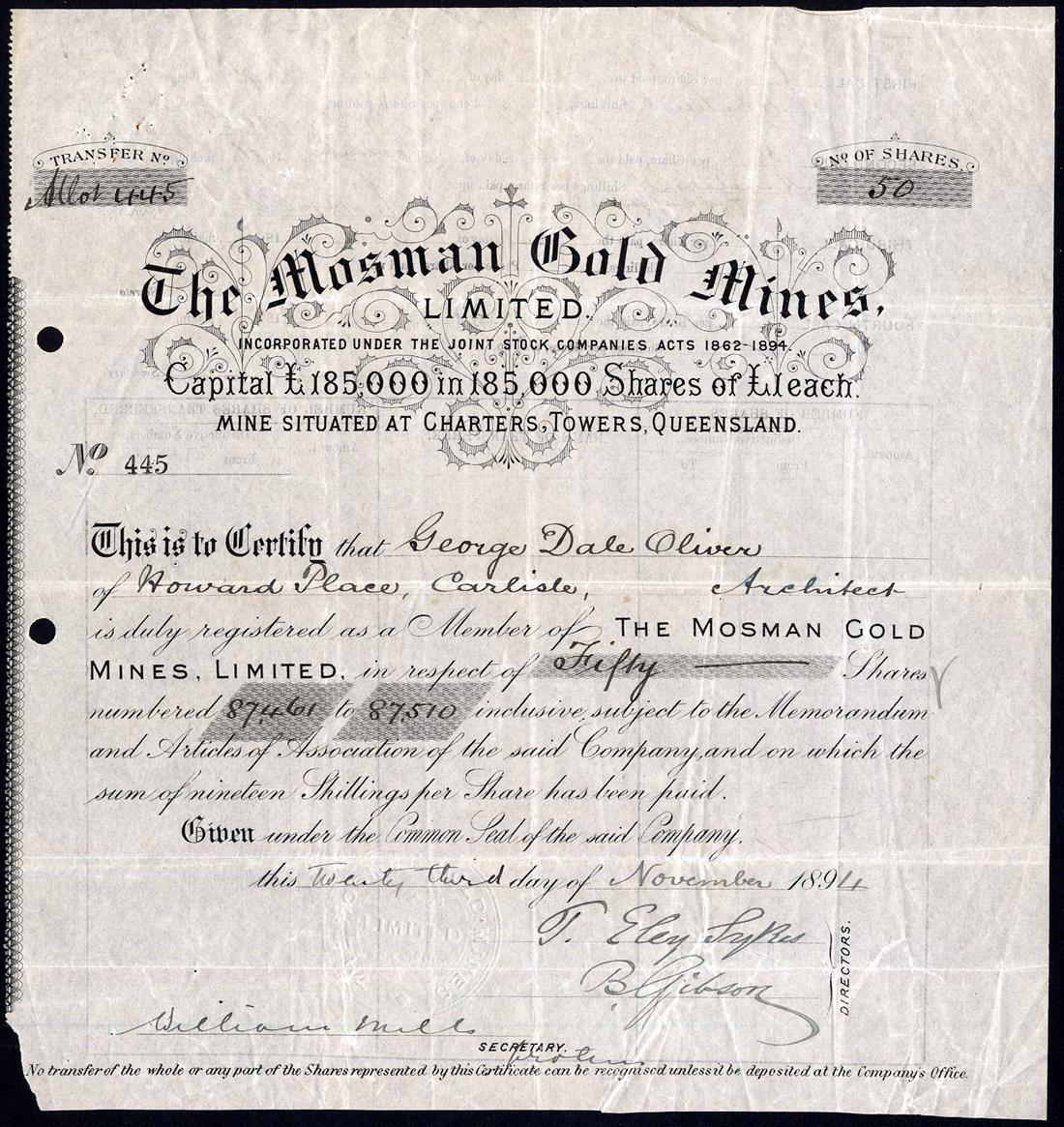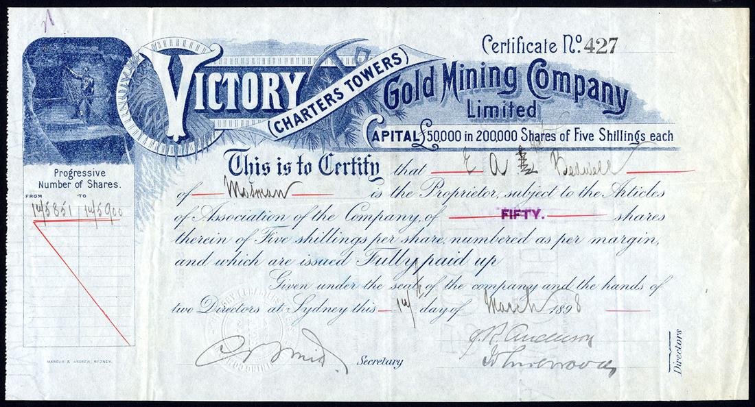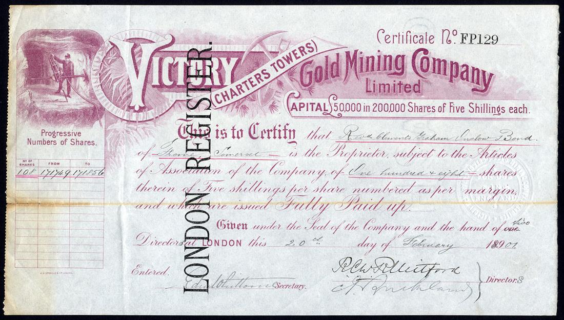 Queensland: A small group of Charters Towers Companies, comprising Victory (Charters Towers) Gold Mining Co. Ltd., pair of certificates for 5s shares, Sydney 189[8], no.427 and London 189[1901], no.FP129, both of similar design with miner and rock drill at left, blue and mauve; Charters Towers Consolidated Gold Mines Ltd., 10s shares, 189[5], no.239, and Mosman Gold Mines Ltd., £1 shares, 189[4], no.445, the last with small piece missing from bottom left corner otherwise very fine. (4)