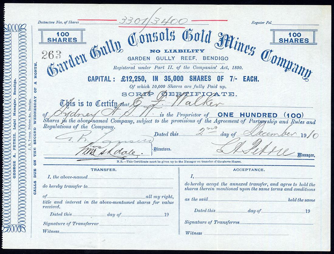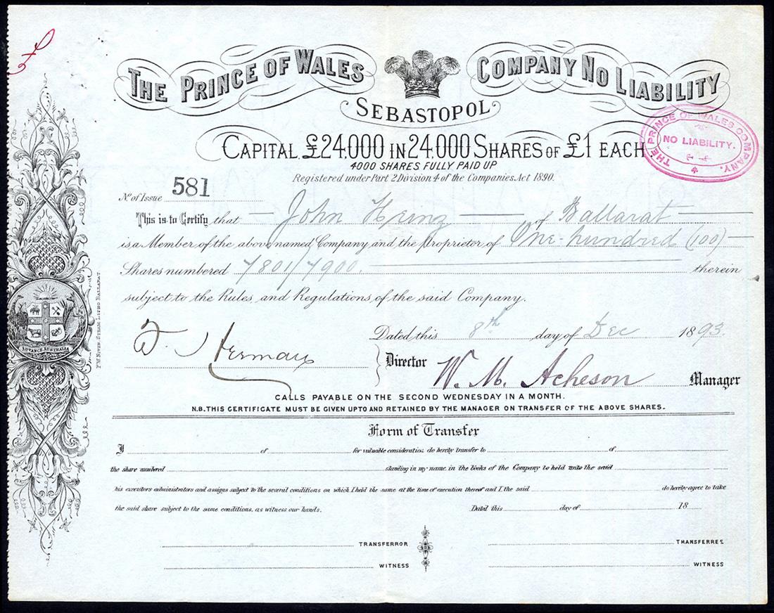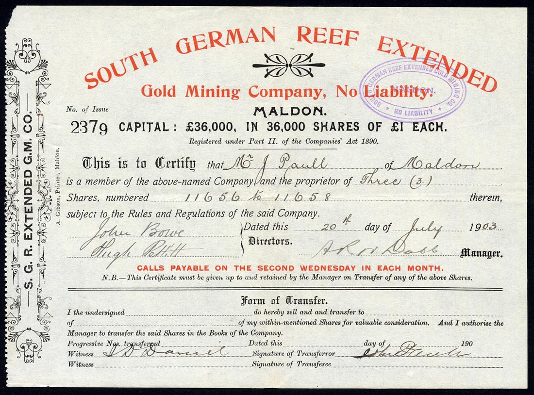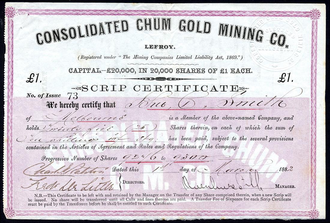 Victoria: A group of locally registered companies, comprising Consolidated Chum Gold Mining Co., Lefroy, £1 shares, 188[2]; Garden Gully Consols Gold Mines Co. NL, Garden Gully Reef, Bendigo, 7/- shares, 19[10]; Hepburn Rocky Lead Gold Mining Co., NL, Mount Prospect, £1 shares, 188[1]; Prince of Wales Co., NL, Sebastopol, £1 shares, 18[93], and South German Reef Extended Gold Mining Co. NL, Maldon, £1 shares, 19[03], the last with tiny piece missing from top left corner, very fine and better. (5)