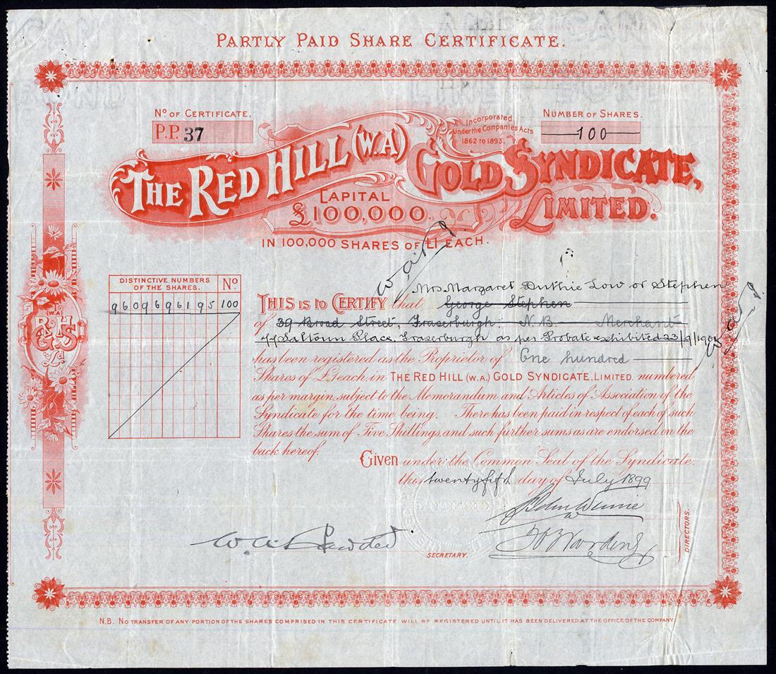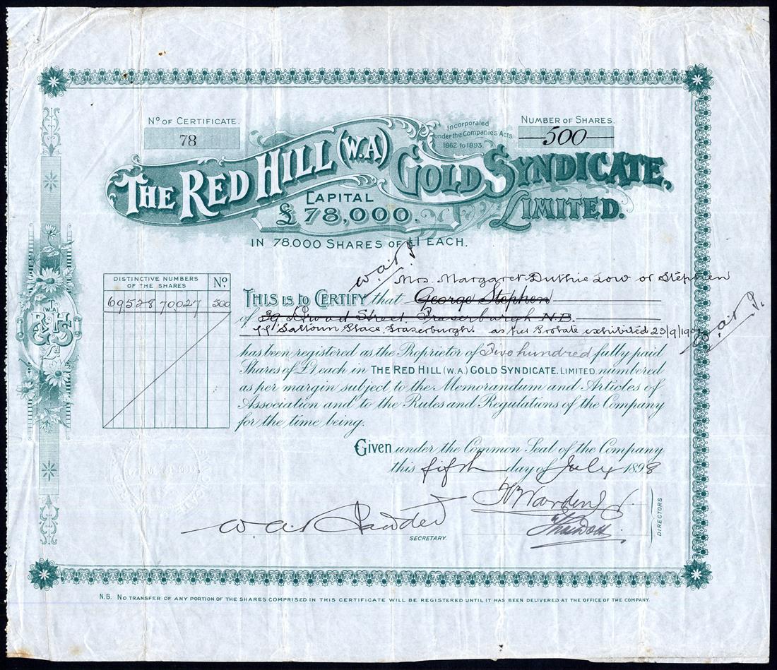 Red Hill (W.A.) Gold Syndicate Ltd., pair of certificates for £1 shares, fully paid, 189[8], no.78, green, and partly paid, [1899], no.37, red, together with Red Hill Westralia Gold Mines Ltd., £1 shares, 190[5], no.444, brown, fine to very fine, all scarce. (3)